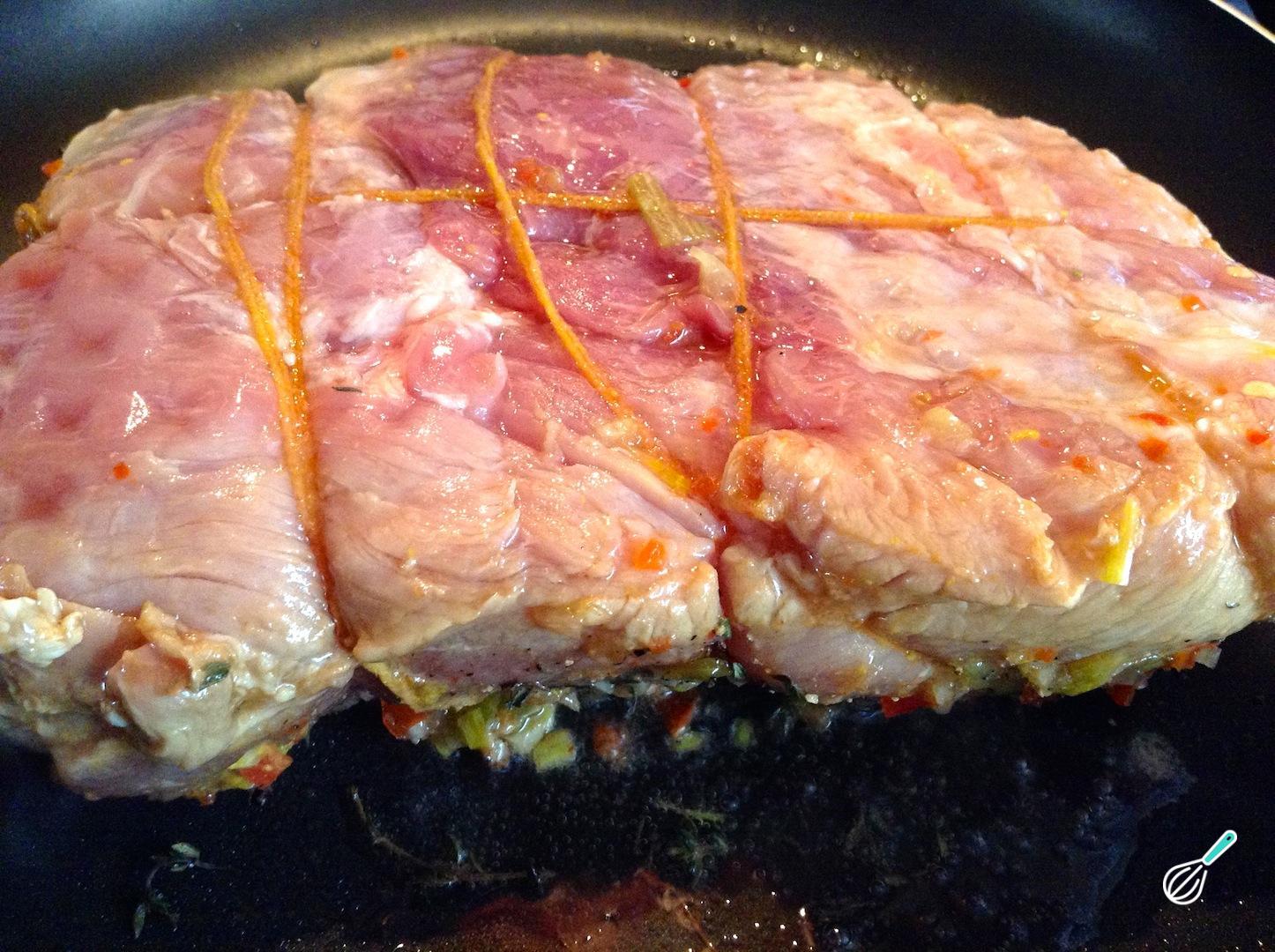 Após o tempo indicado, prepare-se para começar cozinhando o pernil. Para isso tempere a carne com sal e pimenta leve ao fogo médio uma frigideira grande com um pouco de óleo. Quando estiver quente, sele o pernil, ou seja, doure-o bem por fora, para que se mantenha tenro por dentro quando for a assar no forno.