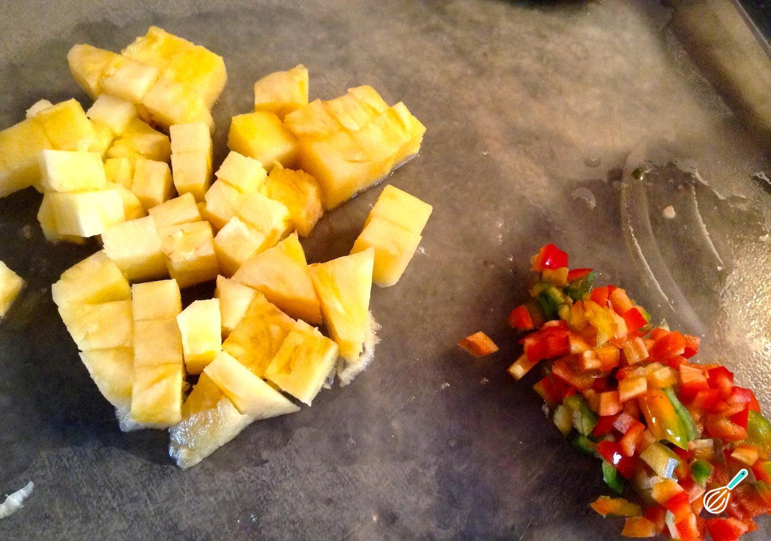 Enquanto isso, prepare o molho de abacaxi desta saborosa receita de Natal. O primeiro passo é descascar e cortar em cubos pequenos o abacaxi e o pimentão.