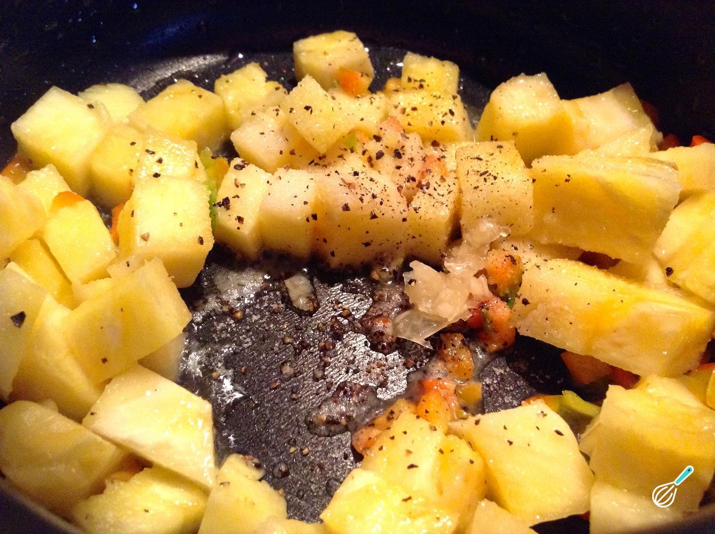 Numa panela funda em fogo médio com um pouco de óleo, salteie o abacaxi e o pimentão temperados com sal, pimenta do reino e pasta de alho a gosto, até que fiquem dourados.