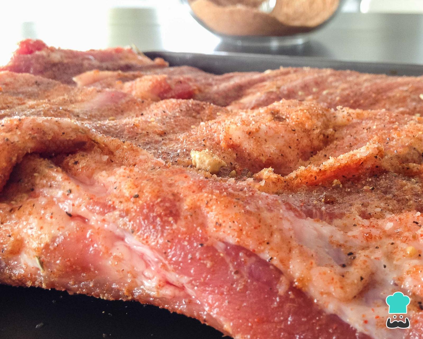 Coloque o pernil fatiado em um recipiente e tempere com sal, pimenta, azeite e o suco do limão. Deixe marinando por meia hora, para pegar o sabor.