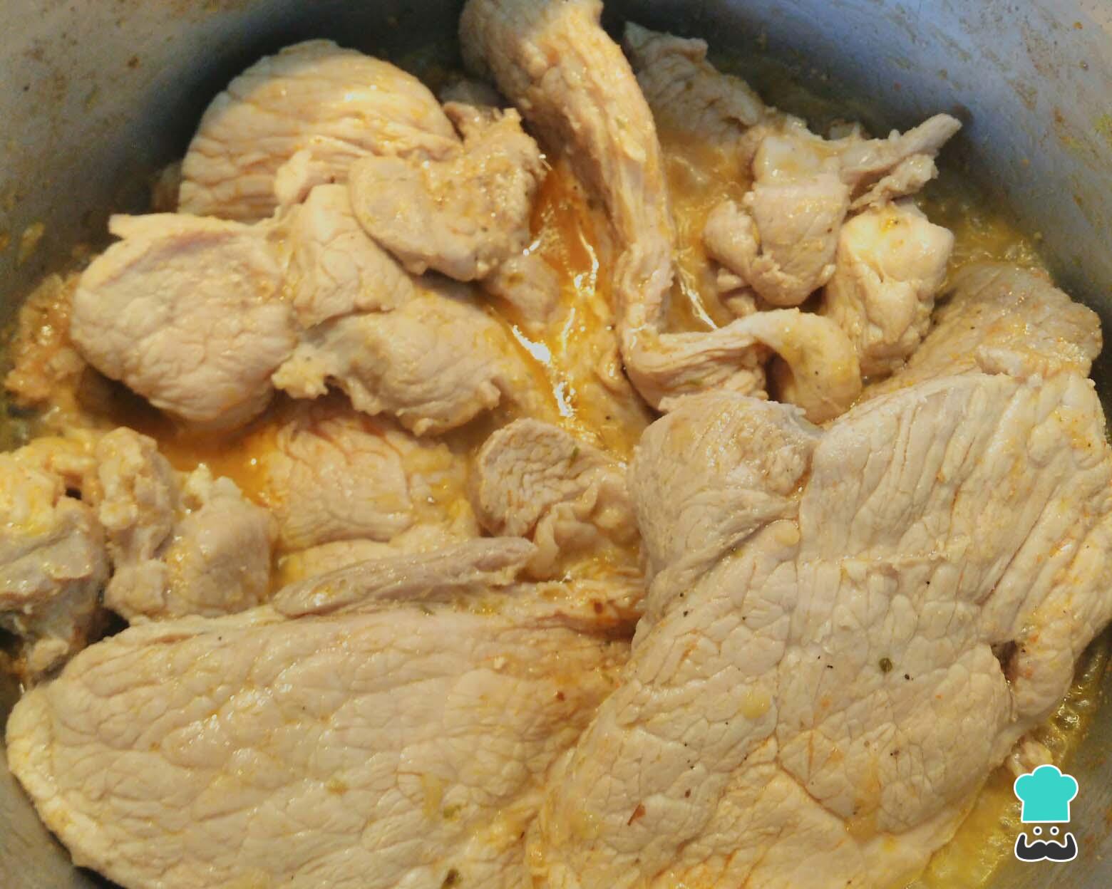 O passo seguinte desta receita de pernil assado na panela é adicionar à panela o pernil e o caldo em que ficou marinando. Junte o colorau e deixe a carne fritar um pouco até que pegue cor. Após, adicione em torno de 150 ml de água e, sem tampar a panela, deixe o pernil cozinhar até que a água seque.