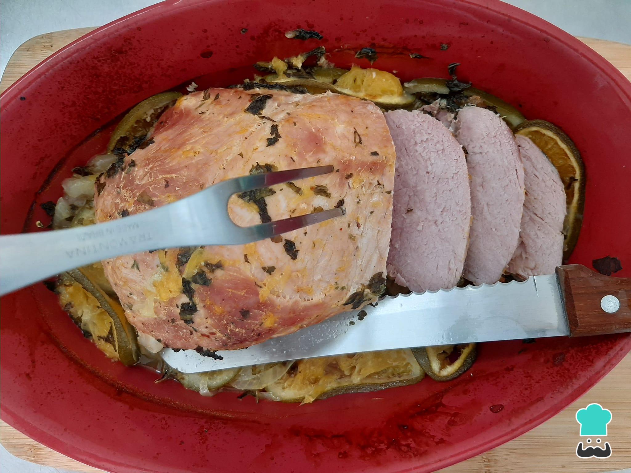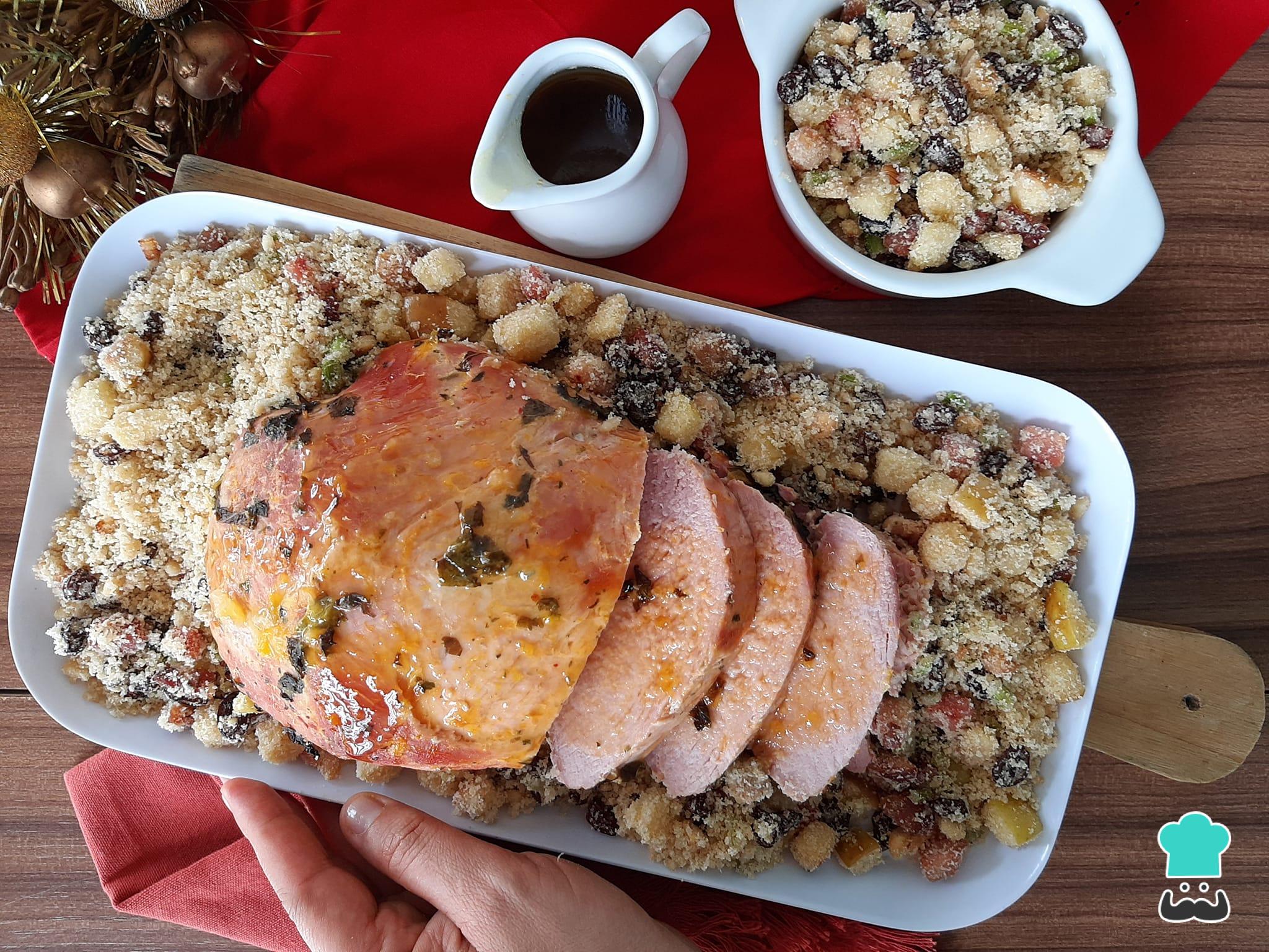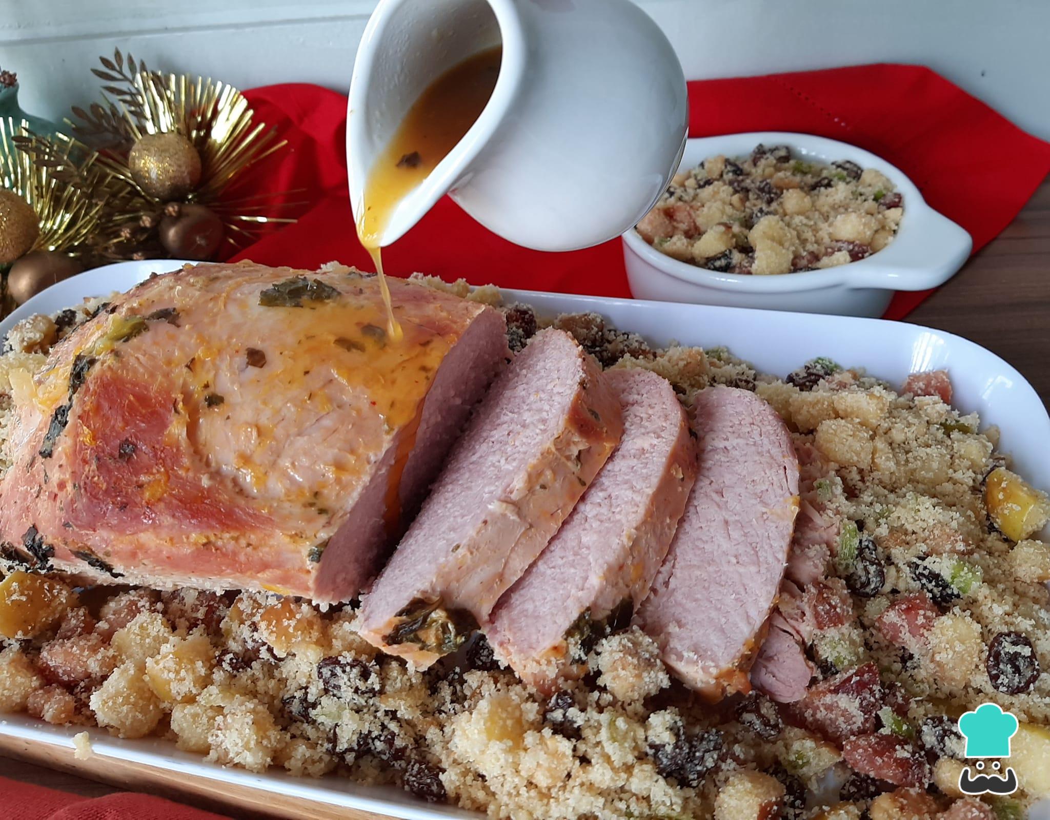 Como fazer Pernil suíno ao forno com farofa de frutas: