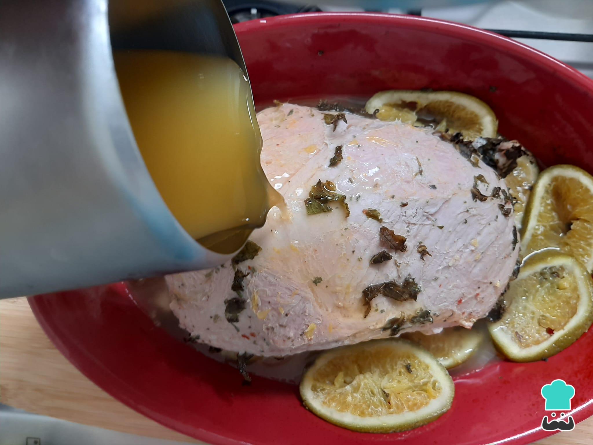 Após esse tempo, retire o papel alumínio e as rodelas de laranja que estavam por cima do pernil e regue-o com o suco de laranja. Leve ao forno novamente sem o papel alumínio, para terminar de assar por mais 40 minutos, aproximadamente.