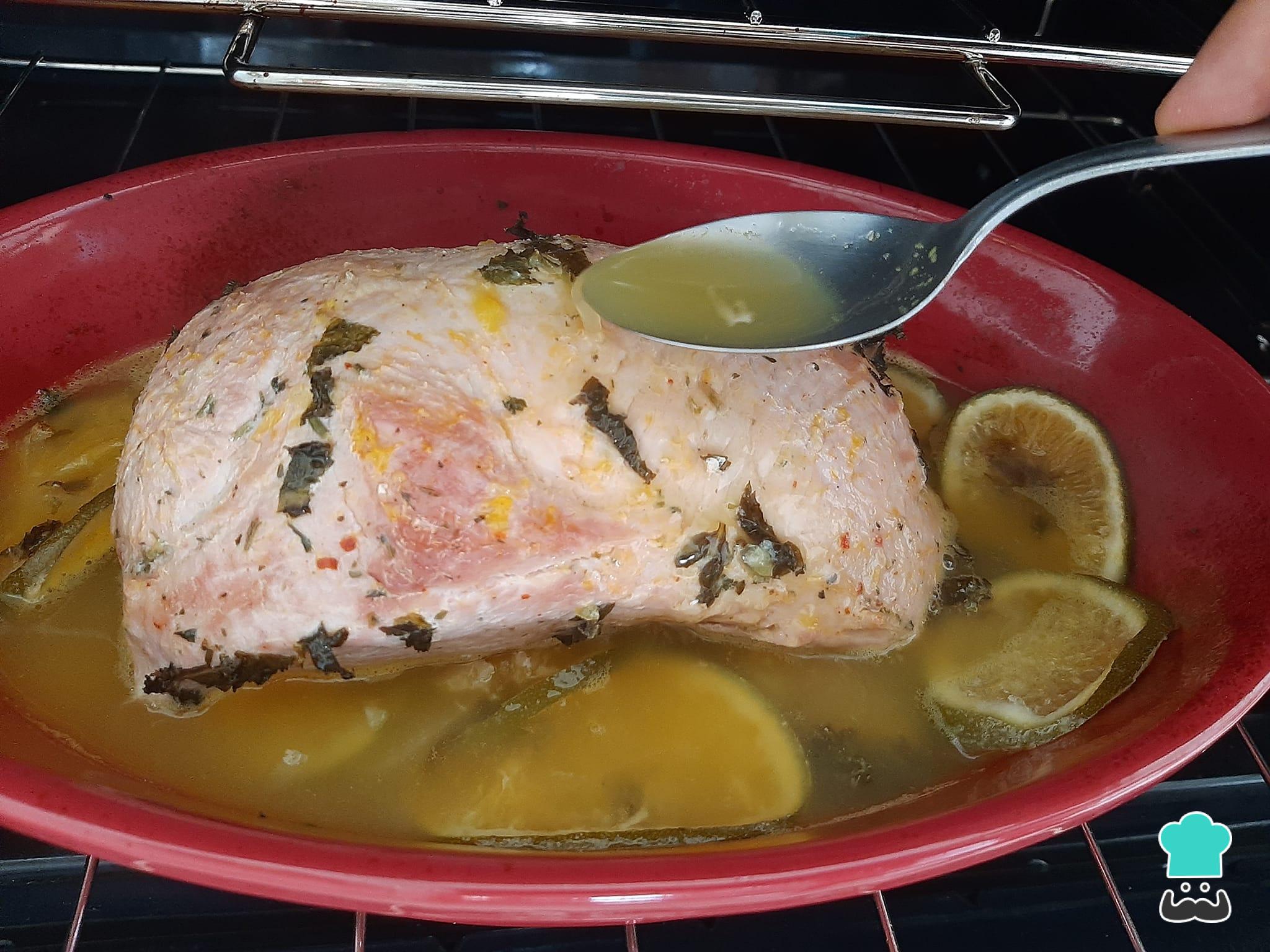 Sempre que puder, abra o forno e vá regando o pernil, com cuidado, com o caldo que se formou no refratário.