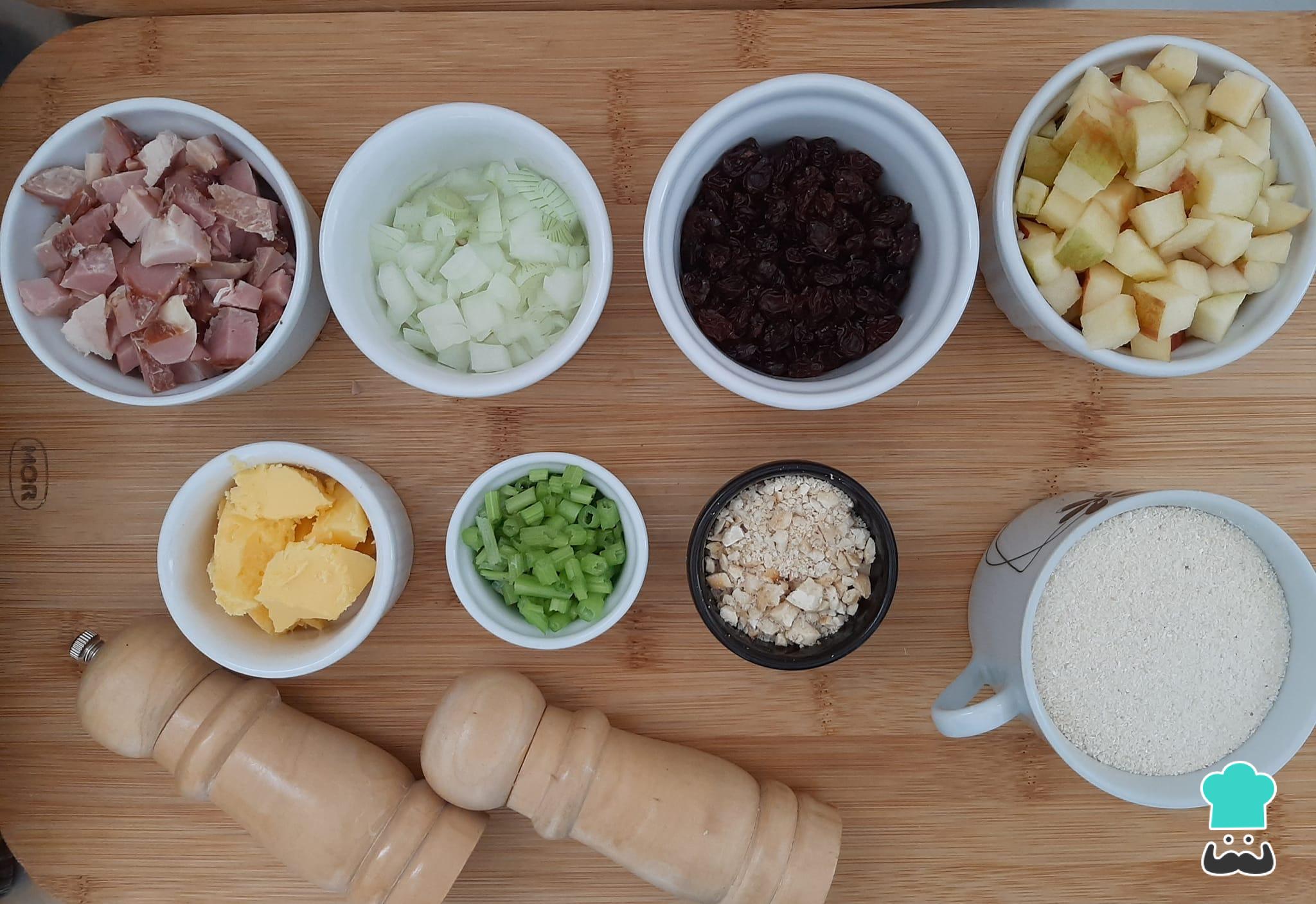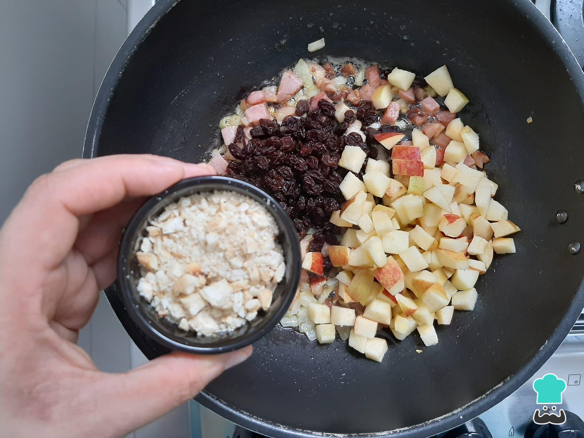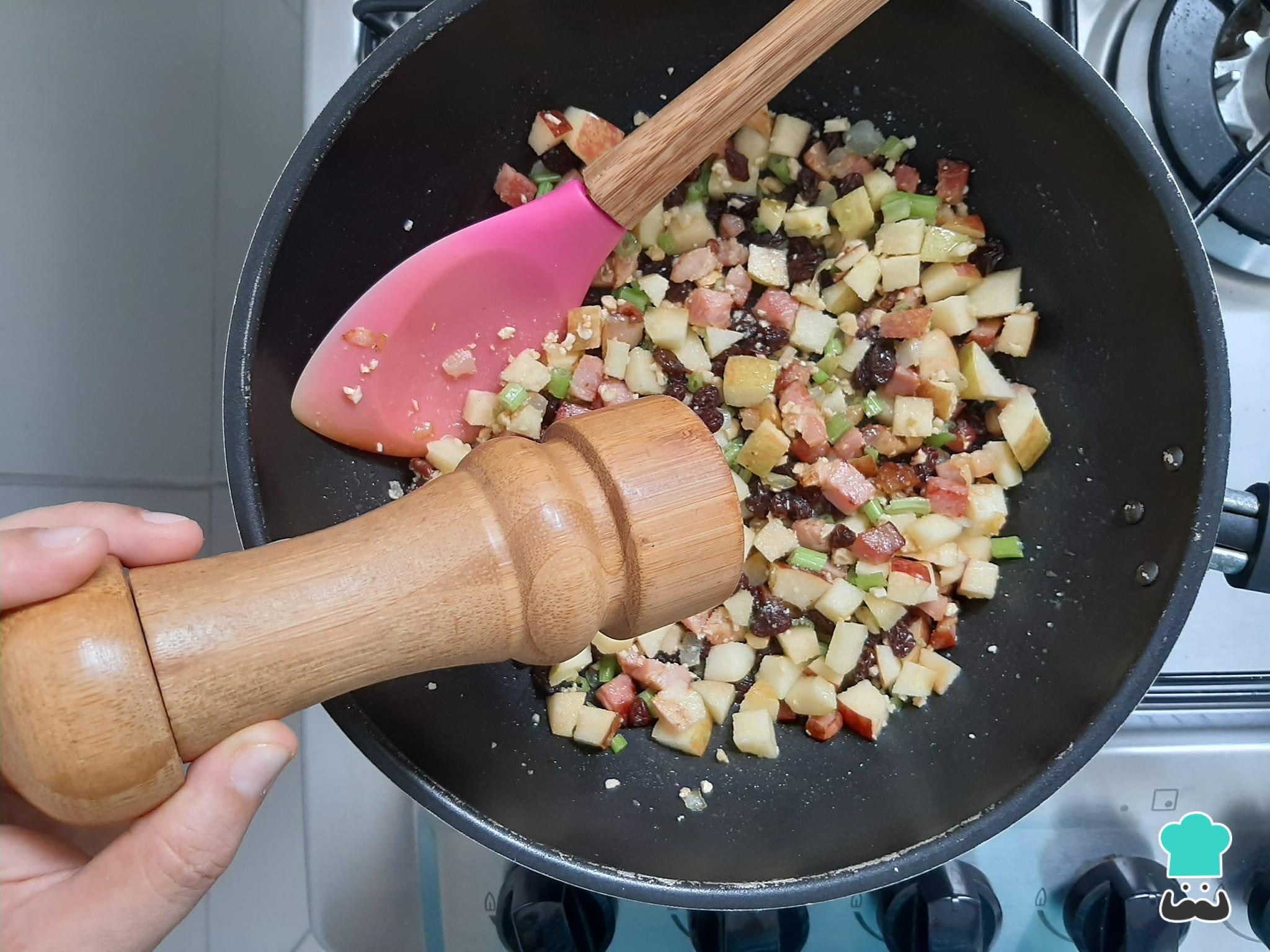 Numa frigideira média, aqueça a manteiga e refogue o bacon e a cebola picada por uns 5 minutos. Adicione em seguida as uvas passas, a maçã picada e as castanhas de caju trituradas, refogando por uns 5 minutos em fogo brando, sempre mexendo para não queimar.