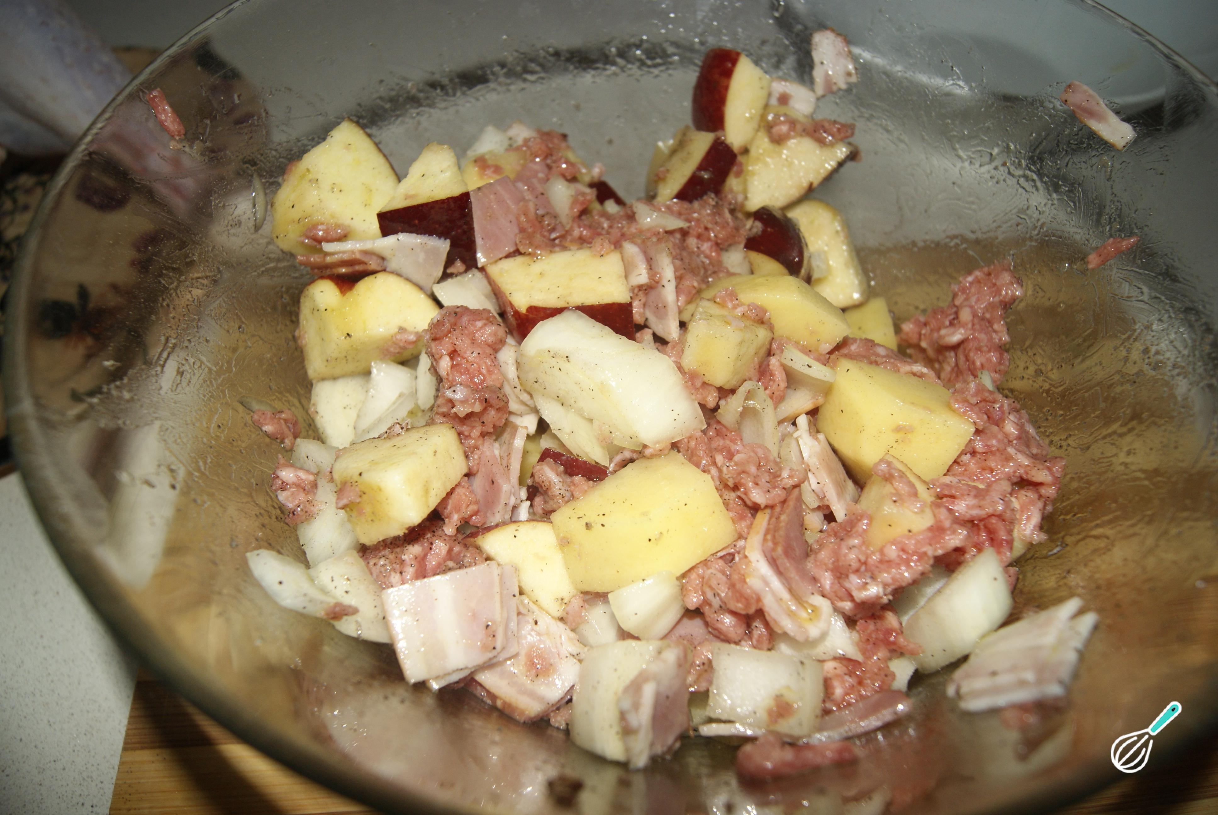 De seguida prepare o recheio do seguinte jeito: descasque a batata e corte em cubos junto com as maçãs e a cebola. Misture estes ingredientes com a carne moída e o bacon picado e tempere a gosto com sal e pimenta.