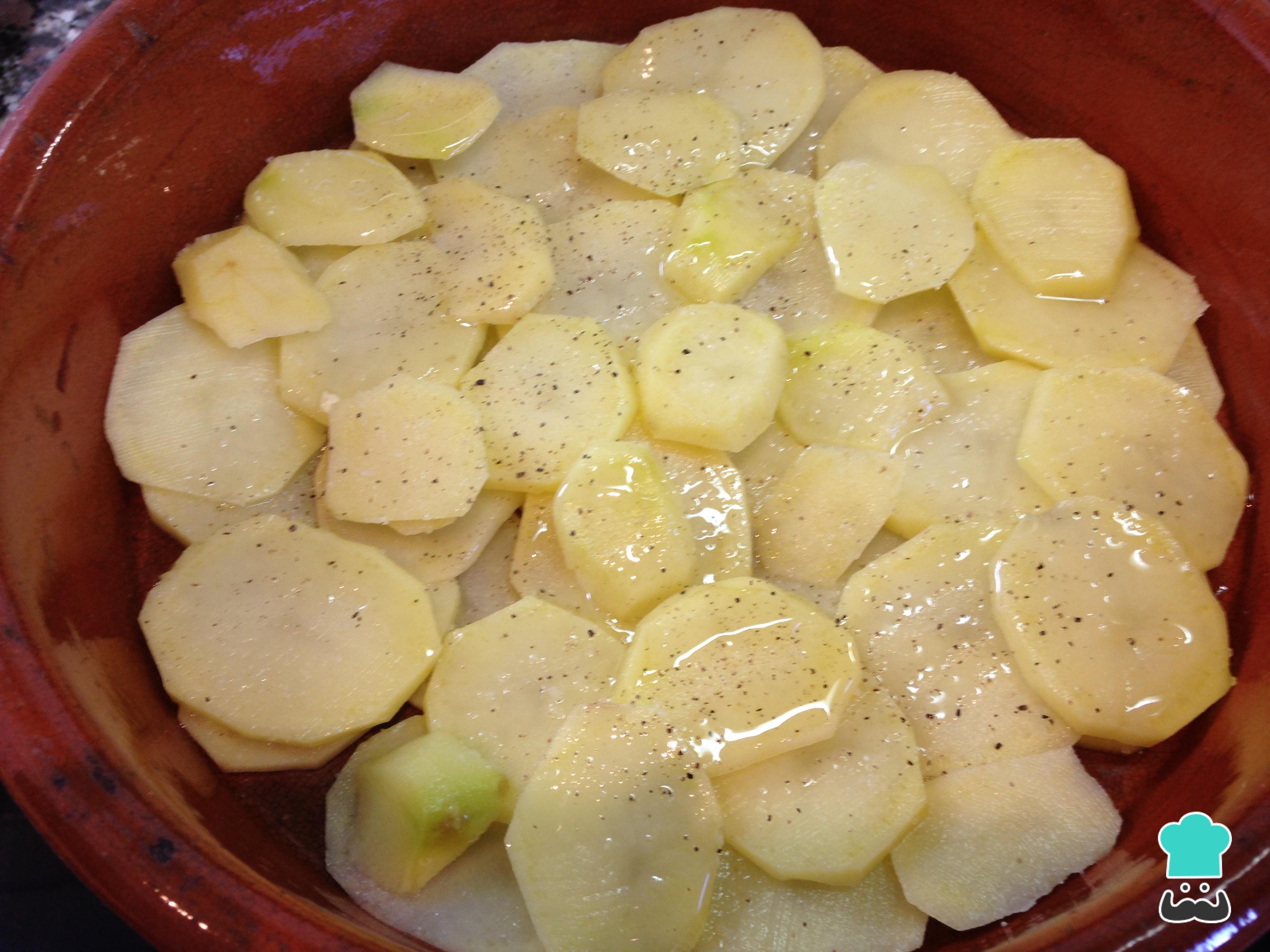 O primeiro passo é preparar as batatas: lave, descasque e corte em rodelas finas. Coloque em uma assadeira untada, regue com azeite e tempere com sal e pimenta.