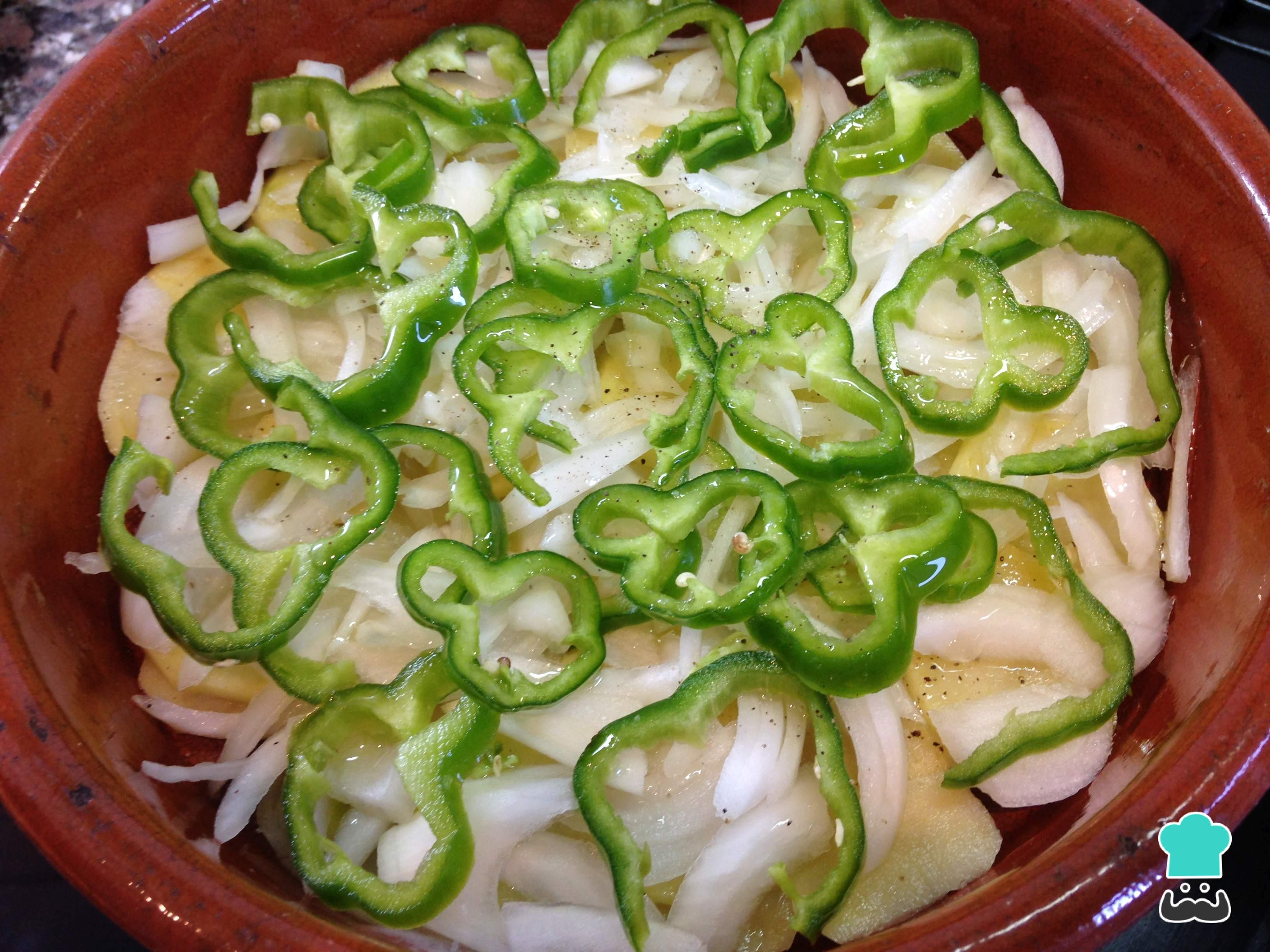Sobre as batatas disponha a cebola cortada em meias-luas e o pimentão em rodelas, sem as sementes. Tempere também com sal e pimenta.
