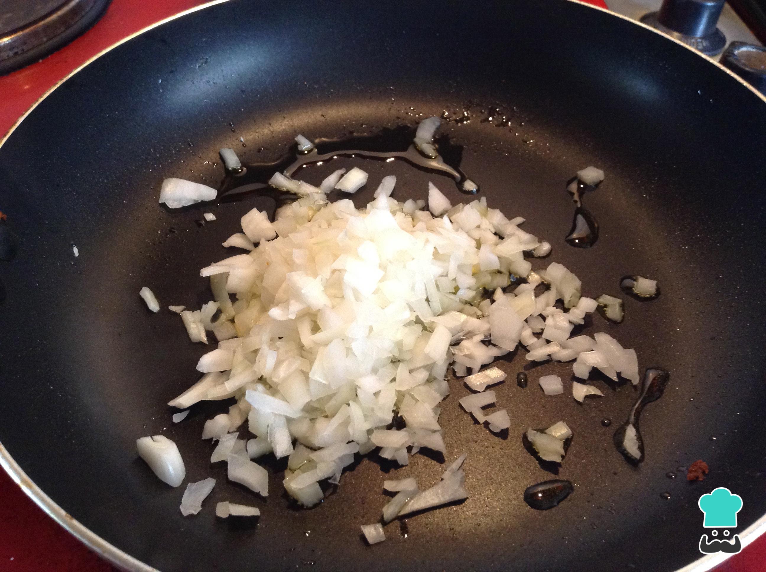 Leve ao fogo médio uma frigideira com o azeite de oliva e refogue nela a cebola, até que fique translúcida.