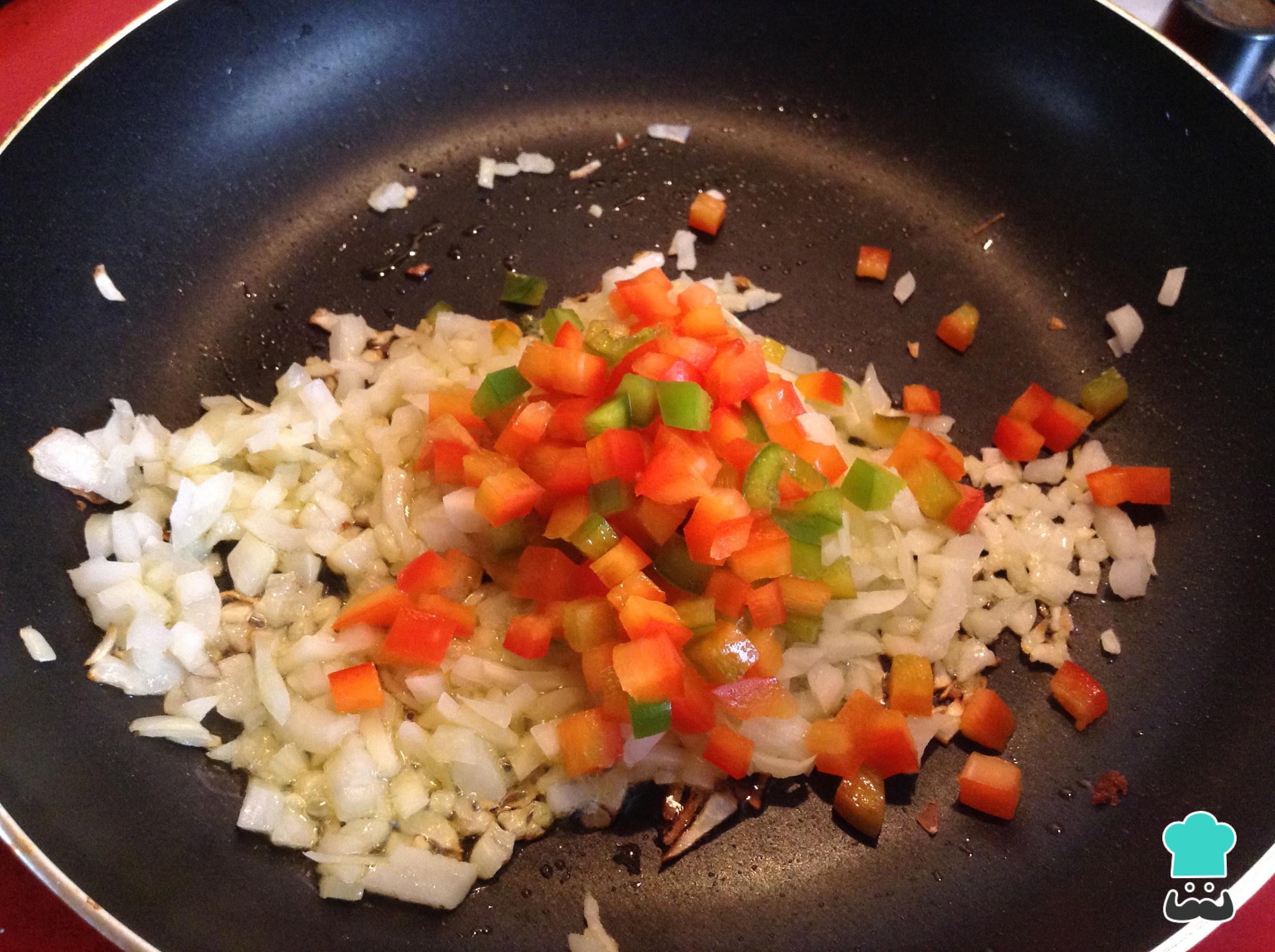 Acrescente o pimentão vermelho, misture e cozinhe por 5-10 minutos esta base do molho marinheiro. Desligue o fogo.