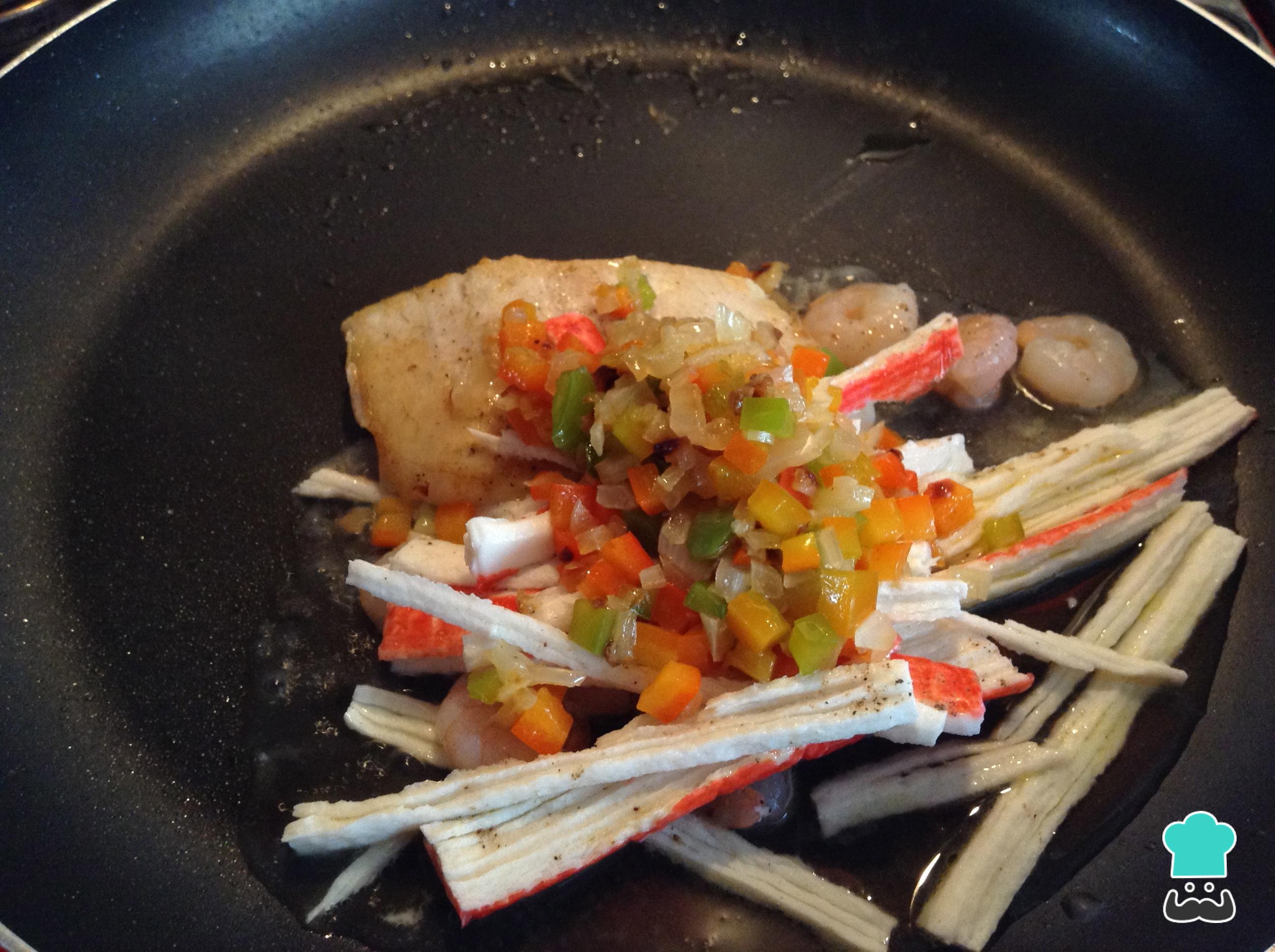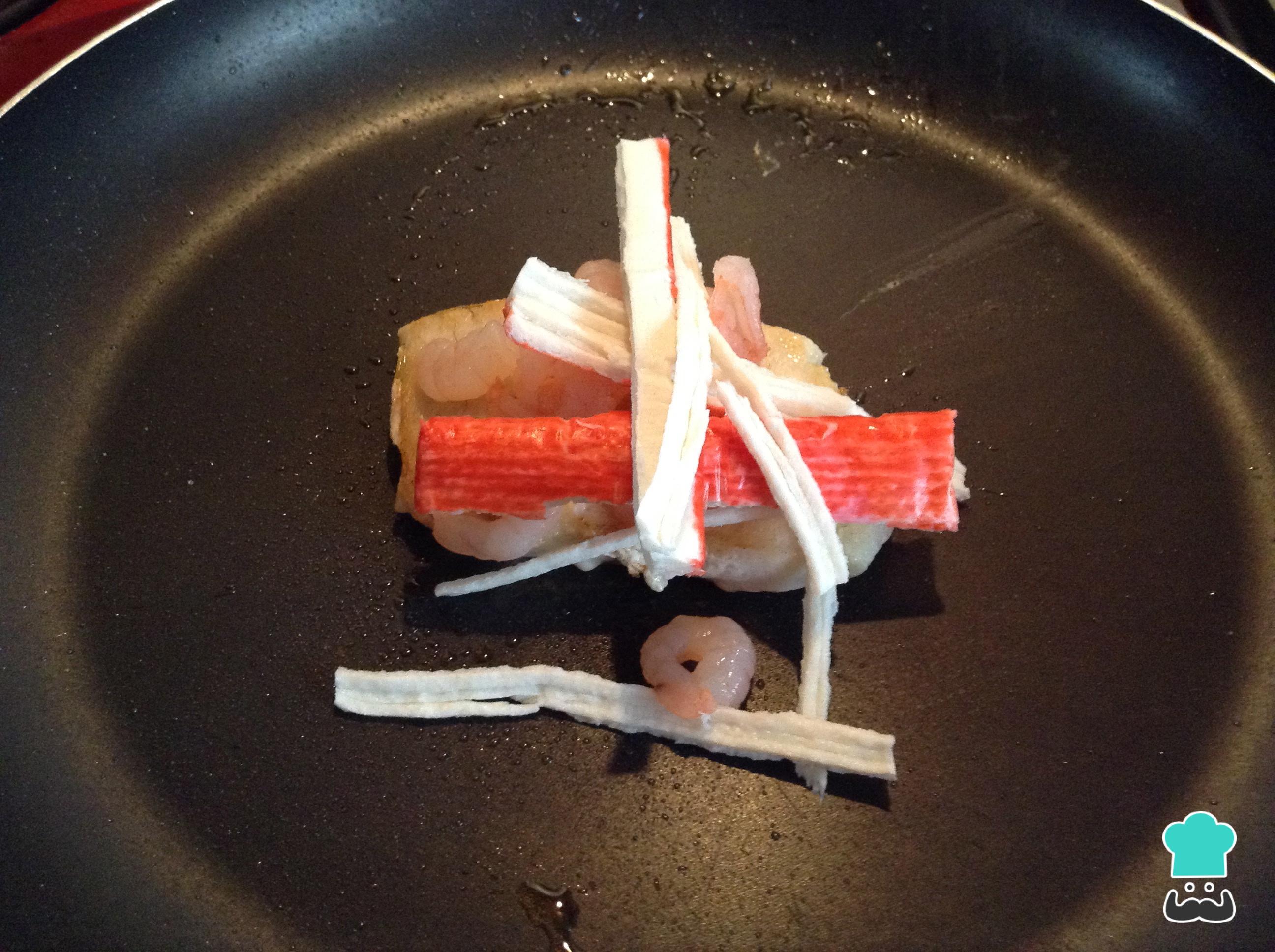 Acrescente à pescada os camarões e o kani-kama cortado em tiras.