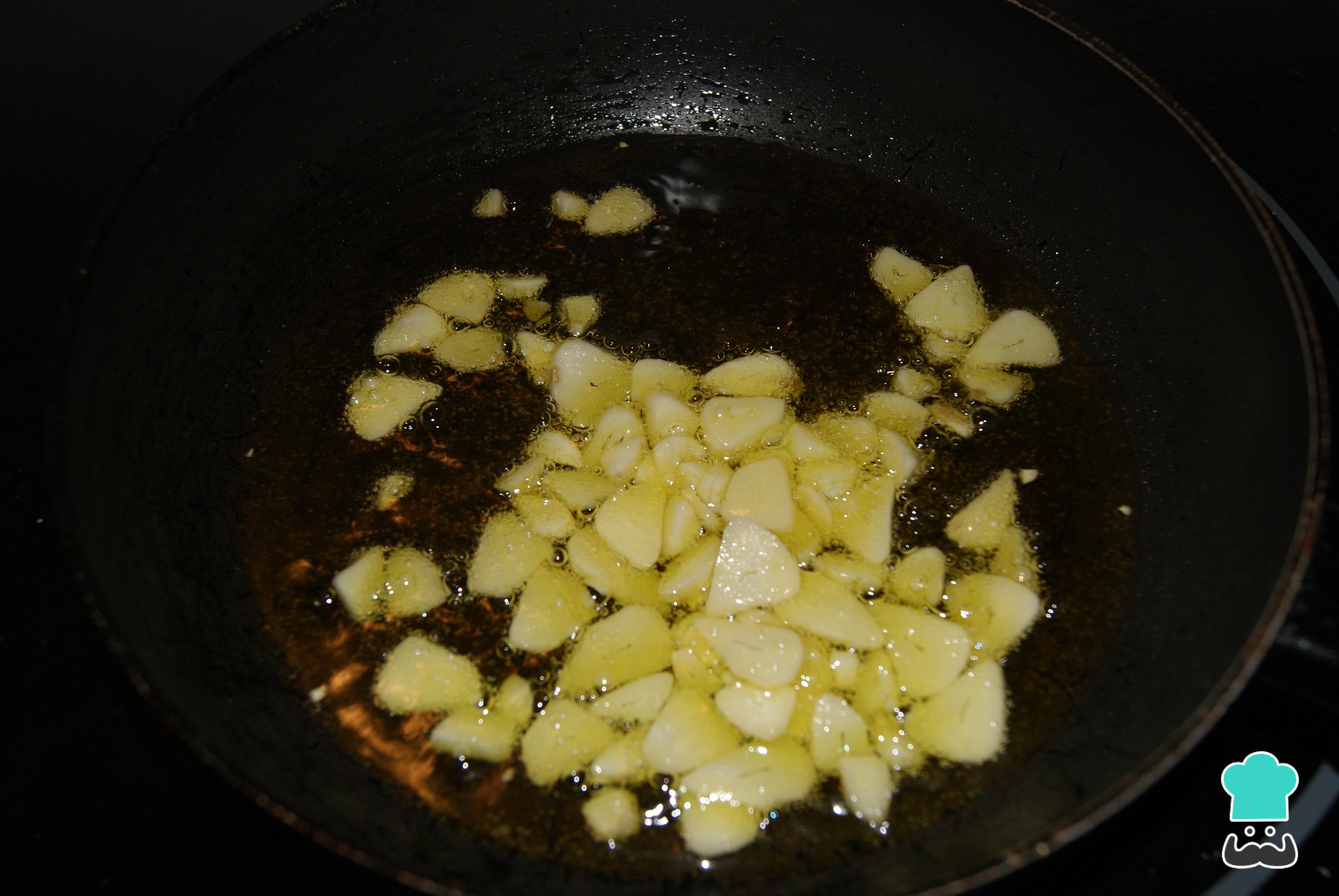 Por último, descasque a cabeça de alho, corte os alhos em fatias e frite em azeite, de modo a dourar sem deixar queimar. Assim conseguimos um azeite aromatizado e dentes de alho fritos para decorar o prato.