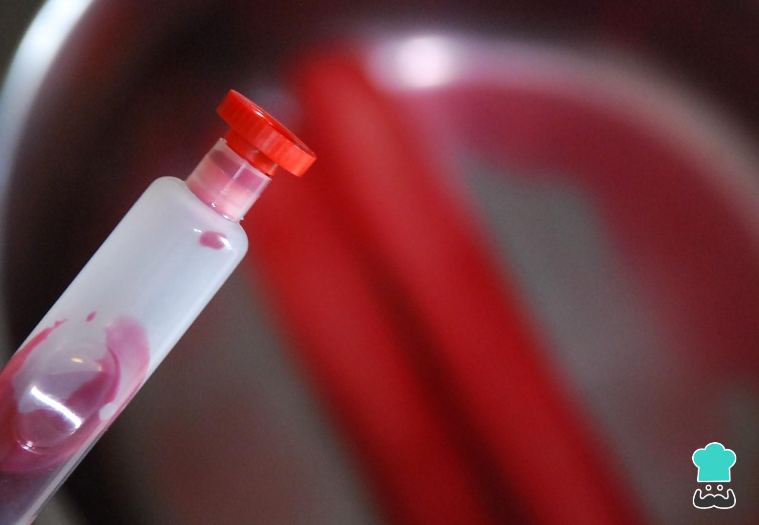 Depois do tempo indicado escorra a maioria da água do cozimento das salsichas. À água que restou adicione algumas gotas de corante alimentício vermelho e, com as salsichas ainda dentro da panela, agite para que elas peguem a cor.