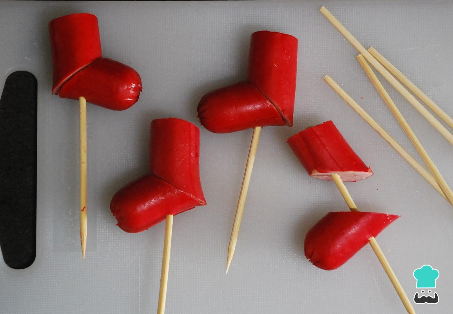Para montar este petisco de botas de Natal una cada ponta da salsicha a uma metade do meio, usando um palito de dente. O ideal é que ambas as partes da salsicha encaixem perfeitamente.