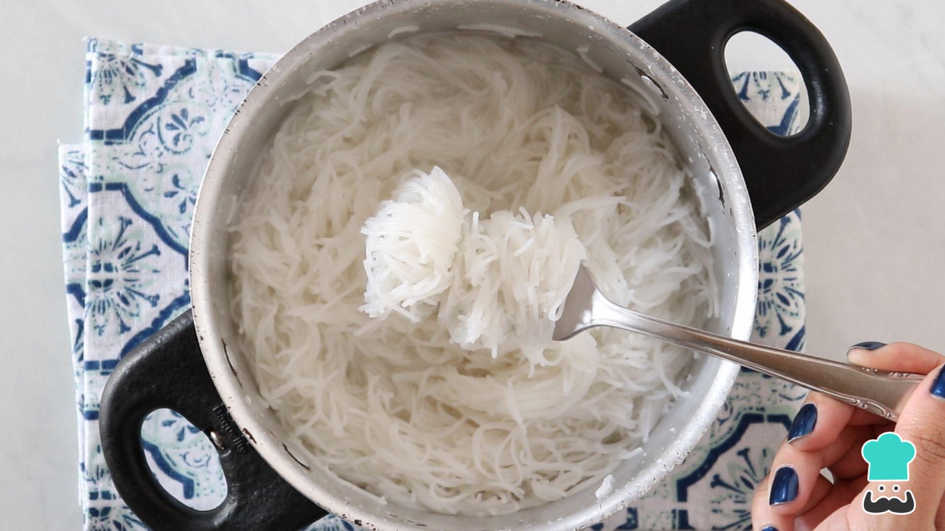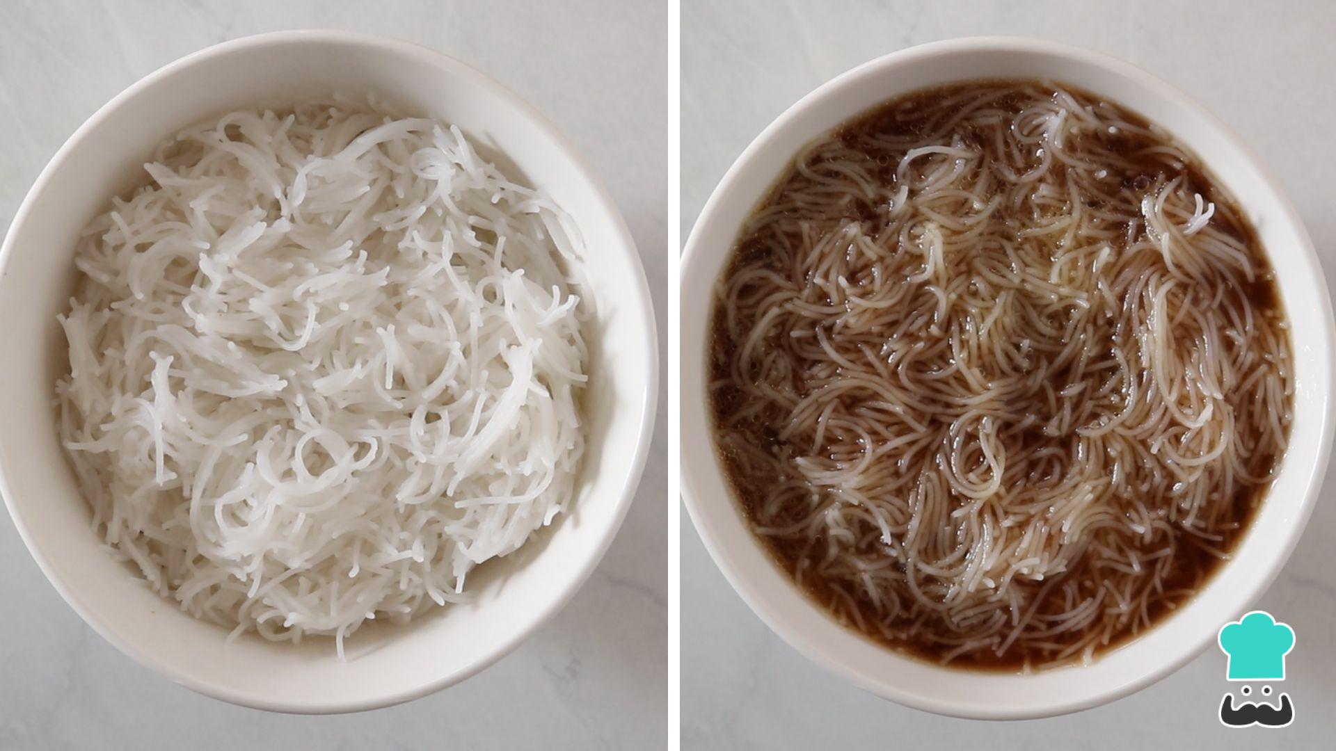 Prepare o macarrão de arroz de acordo com as instruções da embalagem, escorra a água e reserve.