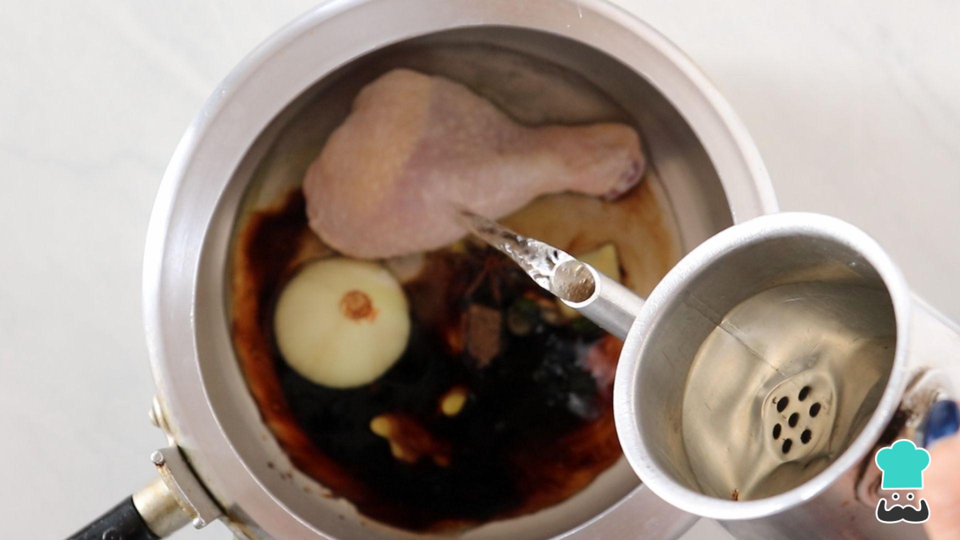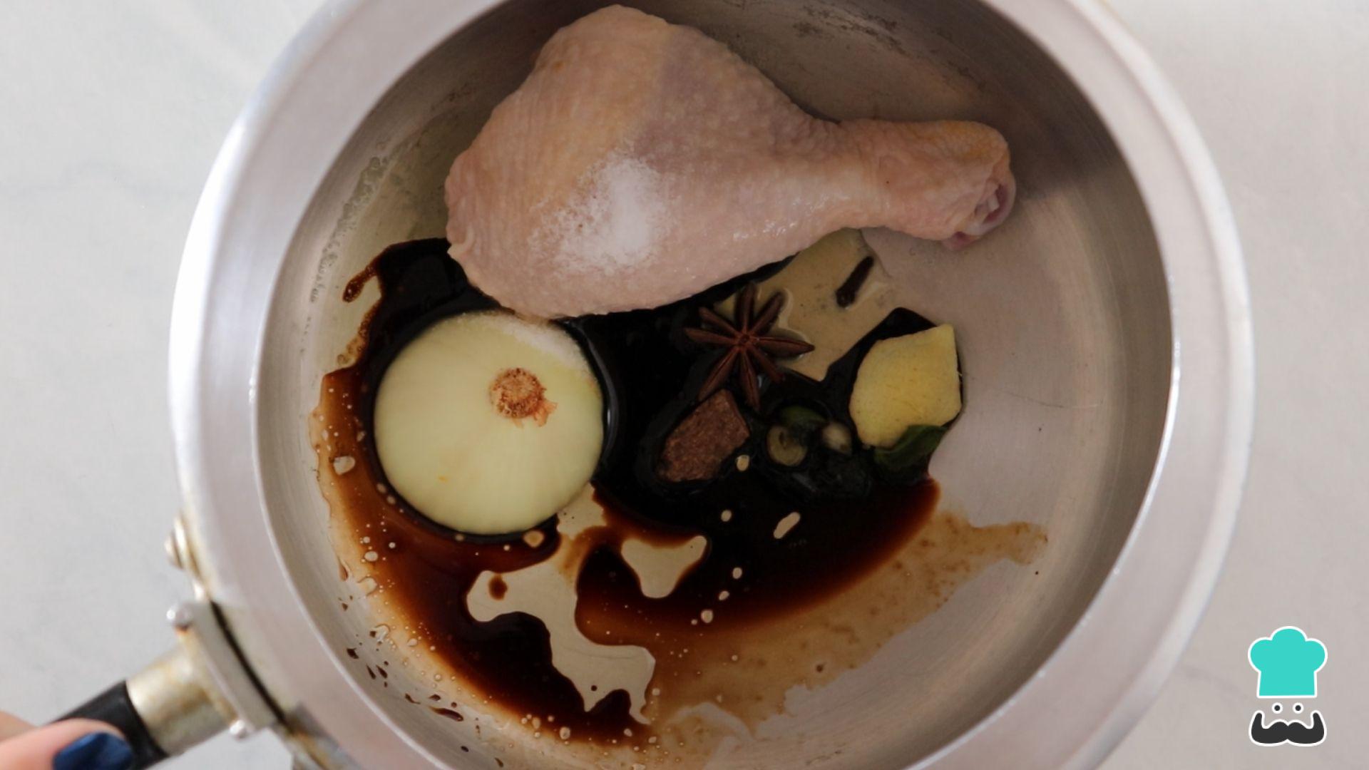 Na panela de pressão coloque a coxa de frango com todos os temperos: o azeite, a cebola, o gengibre, o coentro, o anis estrelado, a canela em pau, o molho shoyu e uma boa pitada de sal.