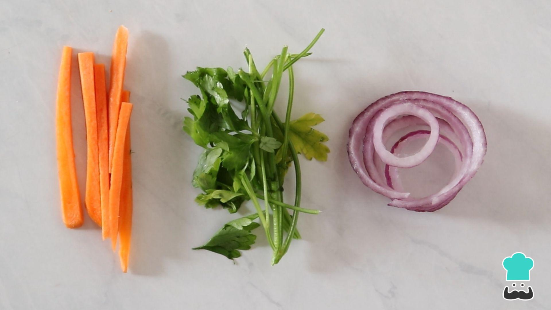 Enquanto isso, corte a cenoura em tiras, a cebola roxa em rodelas e pique grosseiramente a salsinha. Esses ingredientes serão a cobertura da nossa sopa pho.