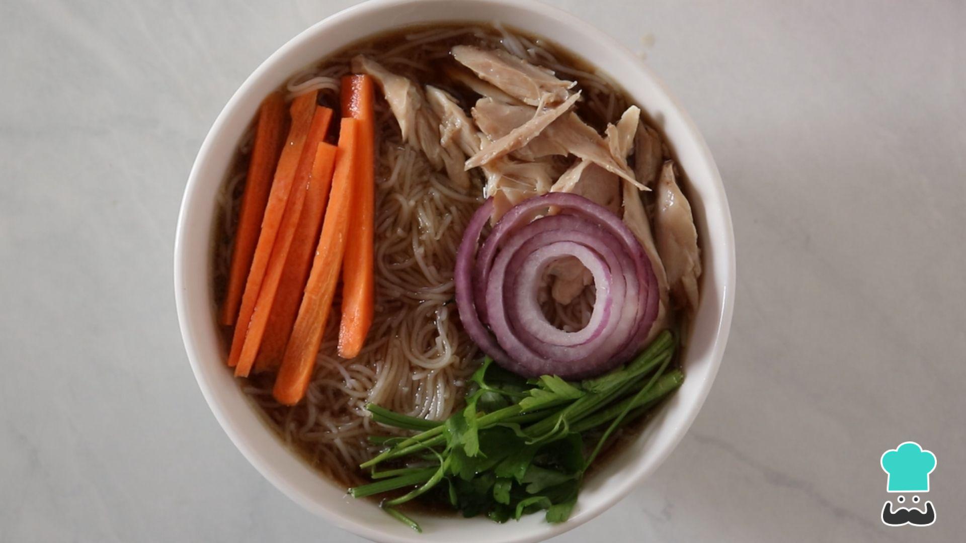 Hora de montar a sopa pho: em uma tigela coloque o macarrão cozido e escorrido e o caldo que coamos anteriormente.