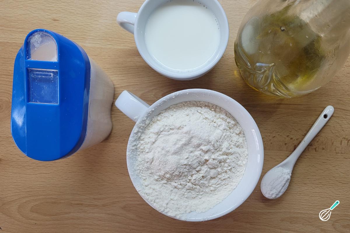 Em uma tigela, misture a farinha, o fermento e o sal. Adicione metade do leite. Não adicione tudo de uma vez, pois a quantidade de leite depende da capacidade de absorção da farinha que estiver usando e pode não ser necessária toda essa quantidade de leite.