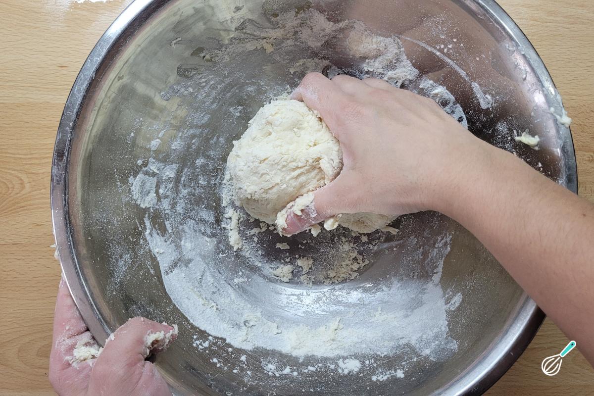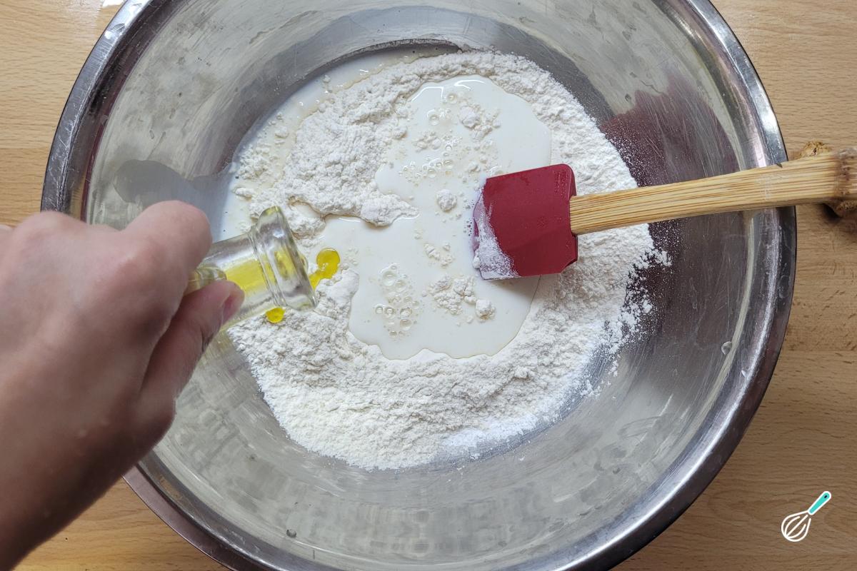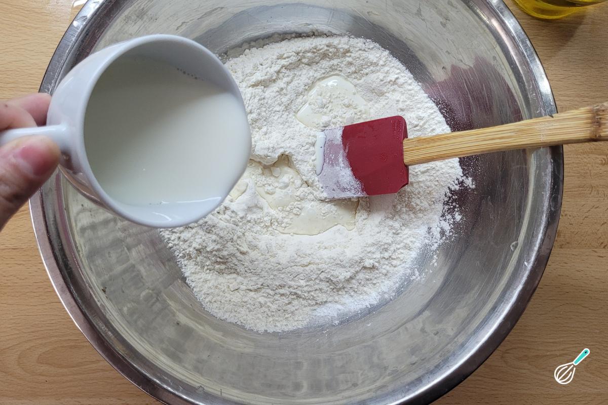 Vá adicionando o restante do leite aos poucos e comece a misturar com as mãos, até que toda a farinha da tigela tenha sido incorporada.