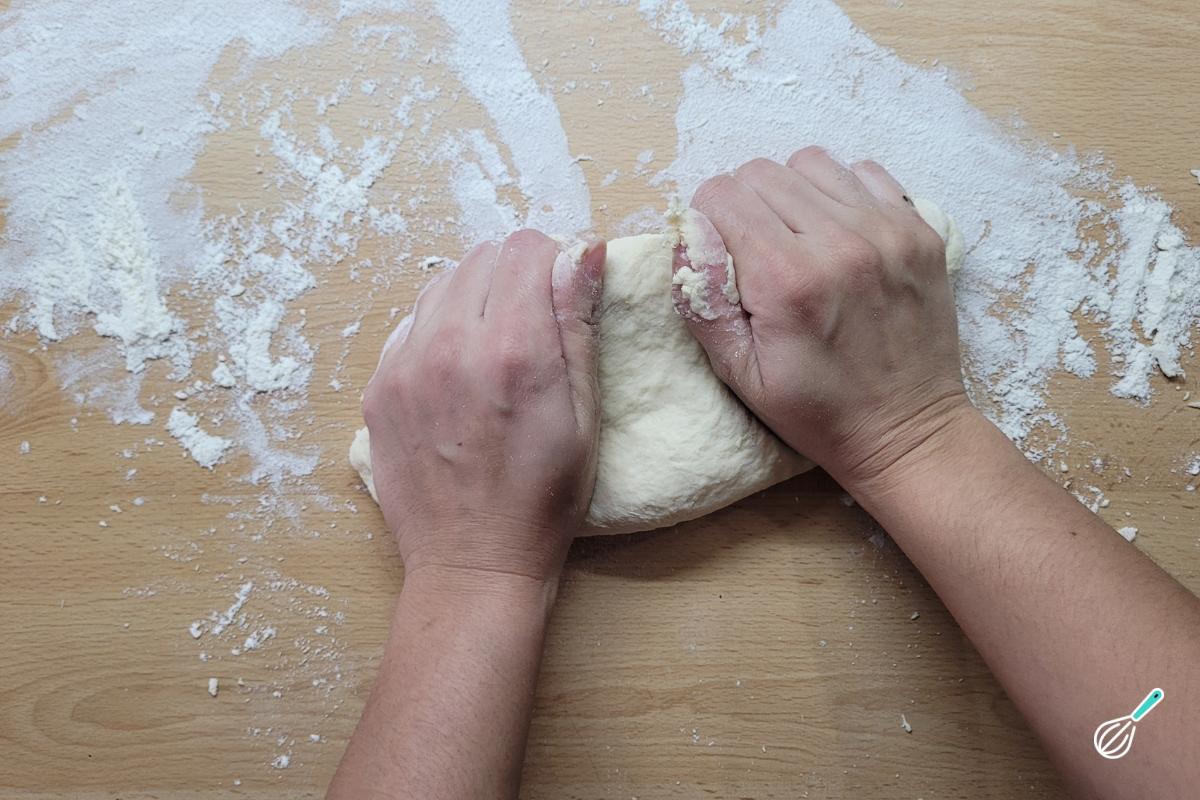 Transfira a massa para uma bancada enfarinhada e sove por cerca de 8 minutos até que a massa esteja lisa, homogênea e elástica.