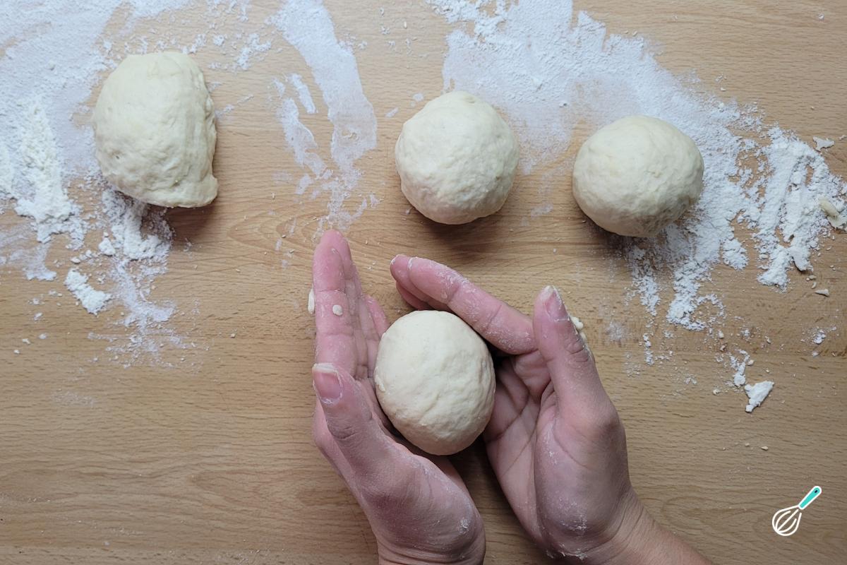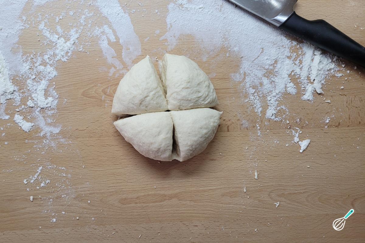 Forme uma bola com a massa e usando uma faca lisa, divida a massa em 4 partes iguais (de cerca de 100g cada). Evite rasgar a massa.