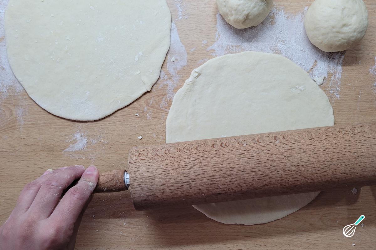 Com um rolo, abra cada uma das bolinhas em um disco. Se estiver grudando, vá polvilhando mais farinha para facilitar na hora de abrir. Deixe sempre os discos abertos na superfície enfarinhada para evitar que grudem na bancada. Se for empilhando os discos conforme for abrindo, coloque sempre farinha entre eles. Enquanto abre os discos, aproveite para colocar uma frigideira para esquentar. A massa precisa entrar na frigideira quente.