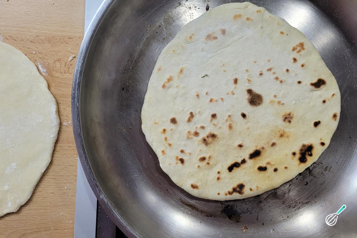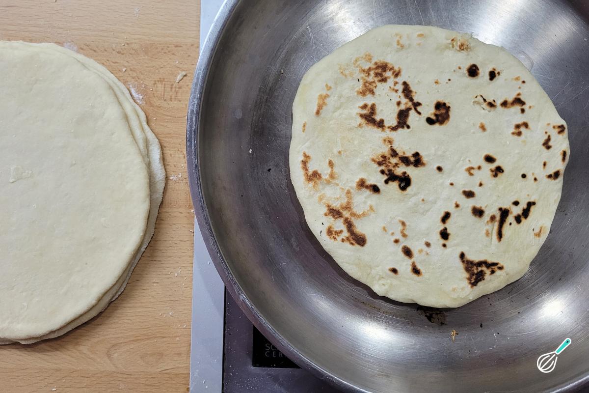 Vá colocando os discos na frigideira quente. Abaixe o fogo, deixe que dourem bem de um lado e vire para dourar do outro lado. Quando estiverem no ponto, eles desgrudam naturalmente da frigideira e fica fácil de virar. Se não estiverem descolando, é porque ainda não assaram por completo e não estão prontos para virar. O ponto é quando a massa fica com essa superfície chamuscada.