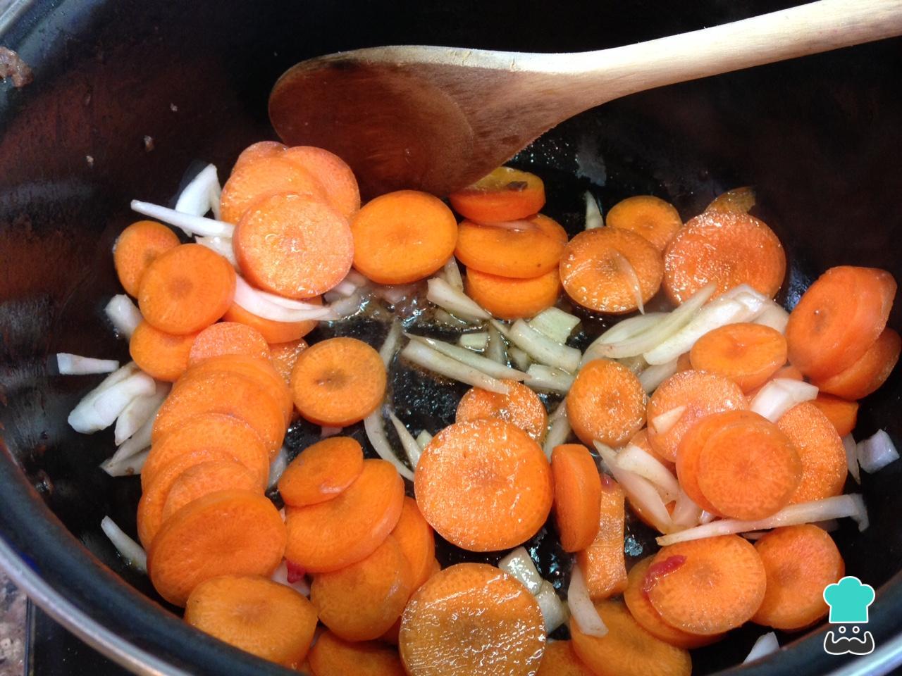 Na mesma panela onde dourou a carne, adicione a cebola cortada em meias-luas e as cenouras descascadas e cortadas em rodelas.