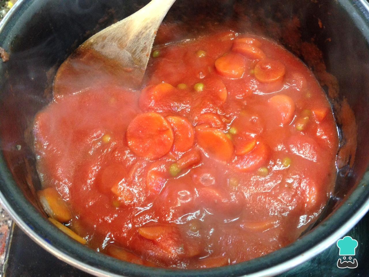 Quando a cebola estiver transparente, o passo seguinte desta receita de picadinho de jardineira fácil é adicionar o molho de tomate e as ervilhas, assim como sal e pimenta. Deixe cozinhar durante 5 minutos em fogo médio.