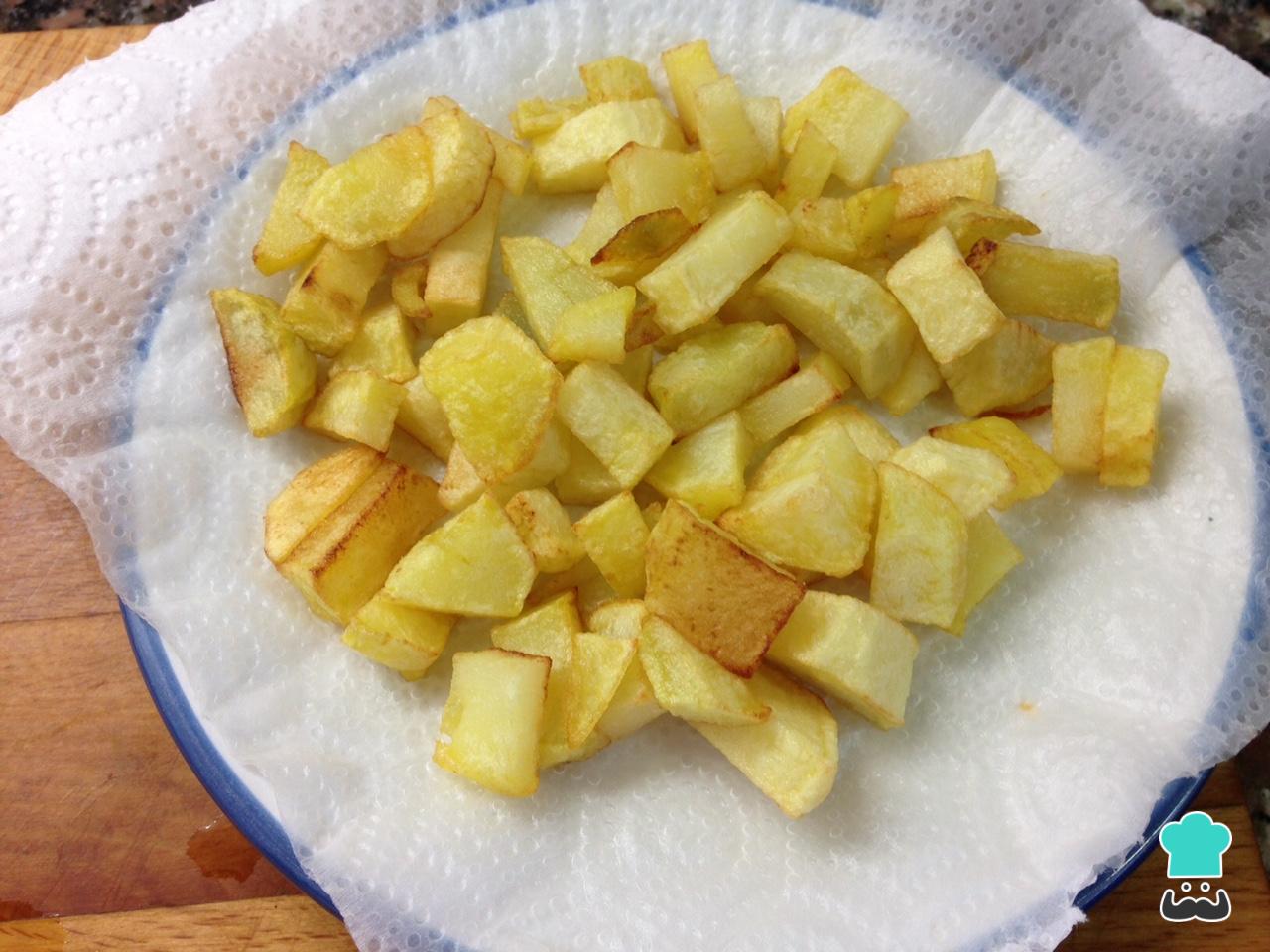 Em outra panela prepare o ingrediente surpresa desta jardineira: frite as batatas cortadas em cubos pequenos. Quando estiverem douradas, retire para um prato com papel absorvente, para que escorram o óleo em excesso, e envolva na jardineira.