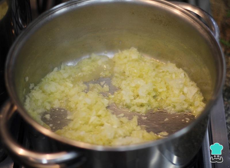 Em uma panela coloque a aquecer o azeite com a cebola picada e as folhas de louro. Quando a cebola se apresentar transparente, adicione a carne e deixe refogar durante alguns minutos.