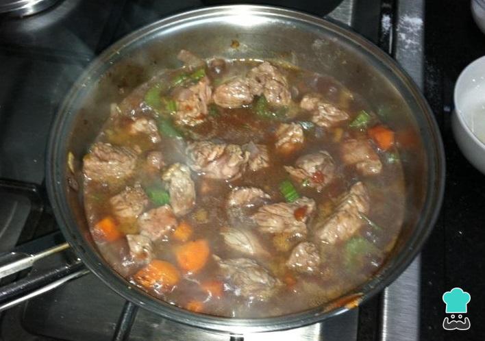 Nesta fase você pode adicionar também legumes em cubos que queira acompanhar com a carne (cenoura, ervilhas, salsão, batatas, etc).