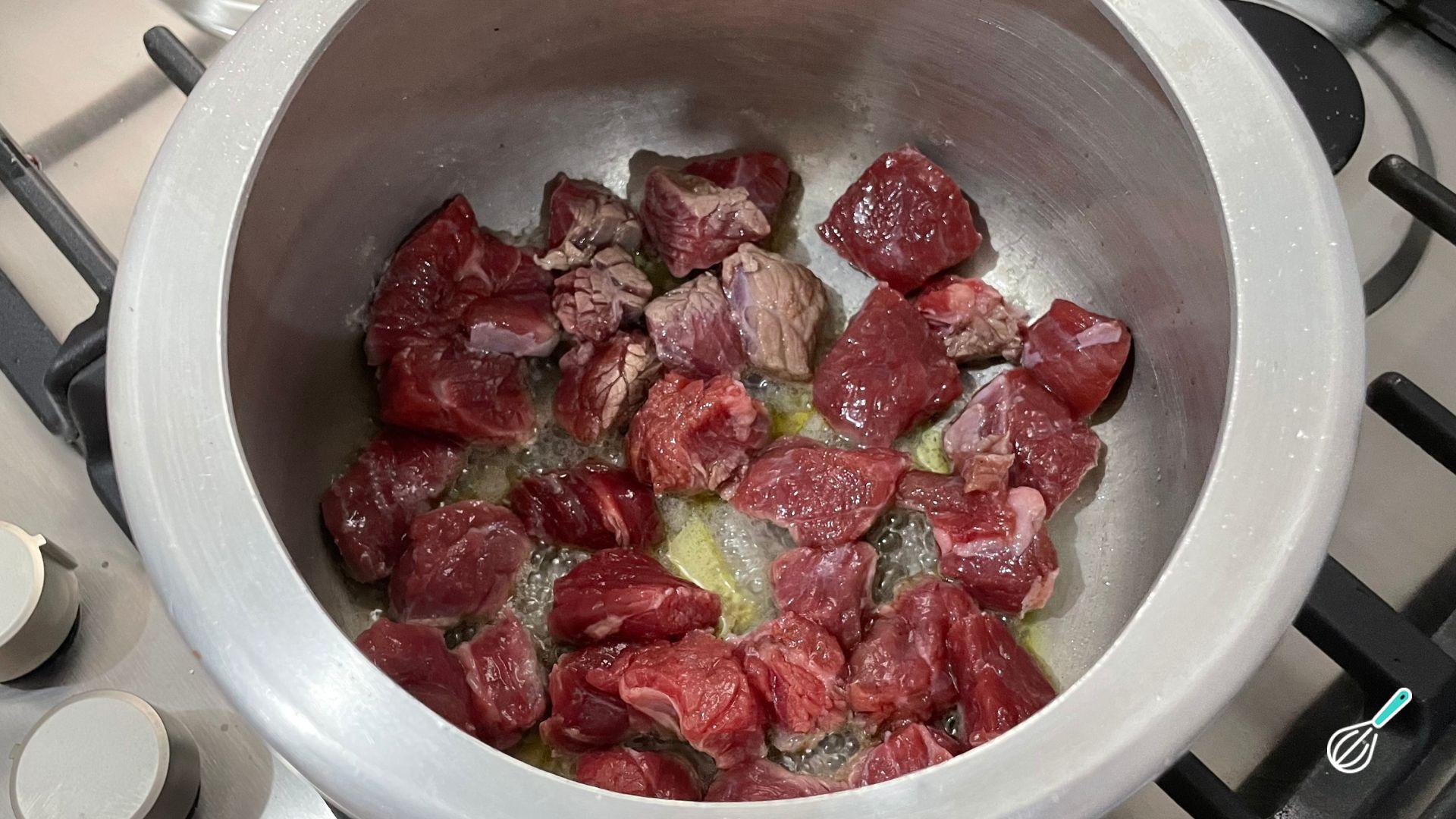 Leve uma panela de pressão para o fogo alto, despeje um fio de azeite e doure todos os pedaços de carne, que já devem estar temperados com sal e pimenta.