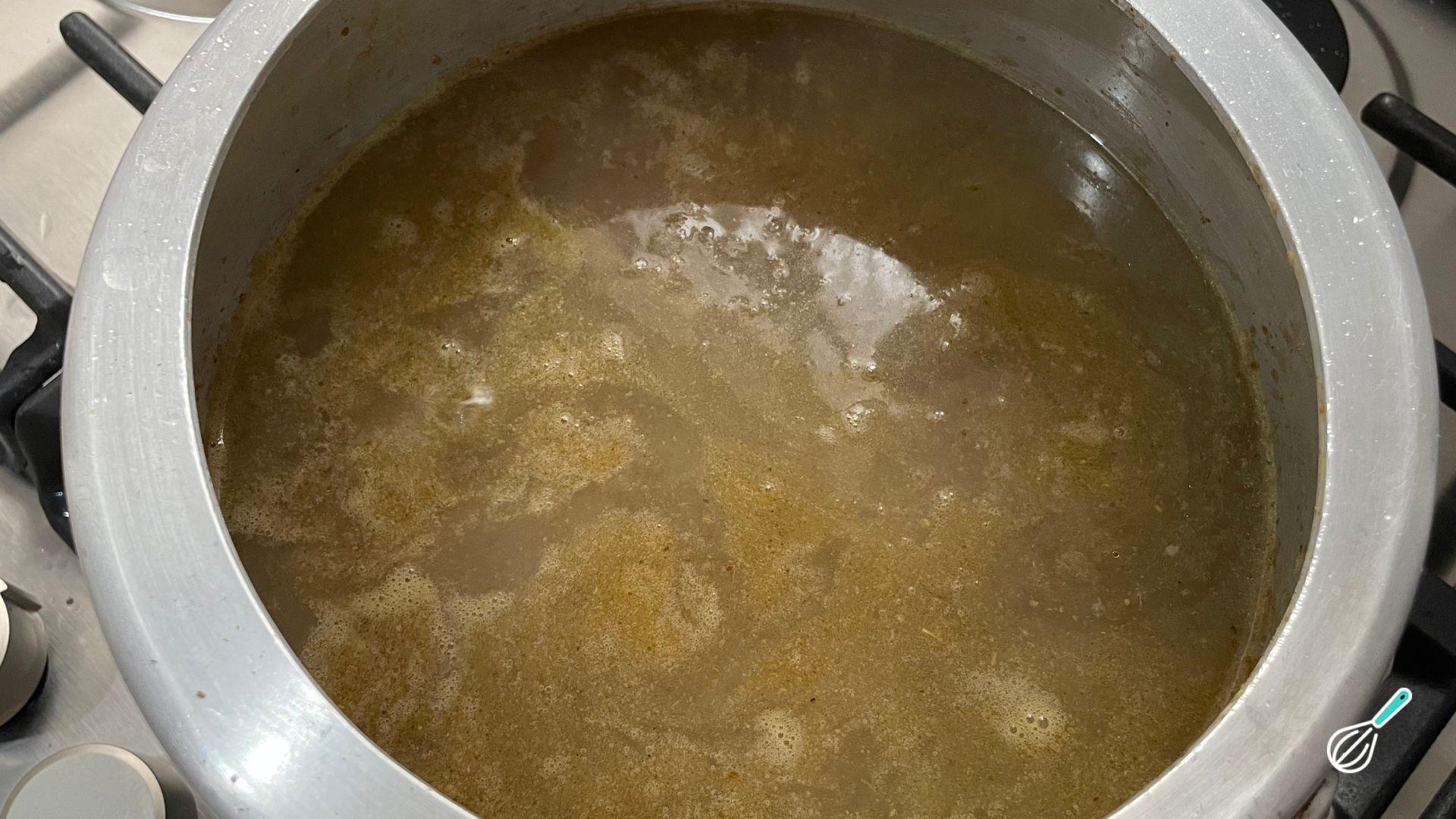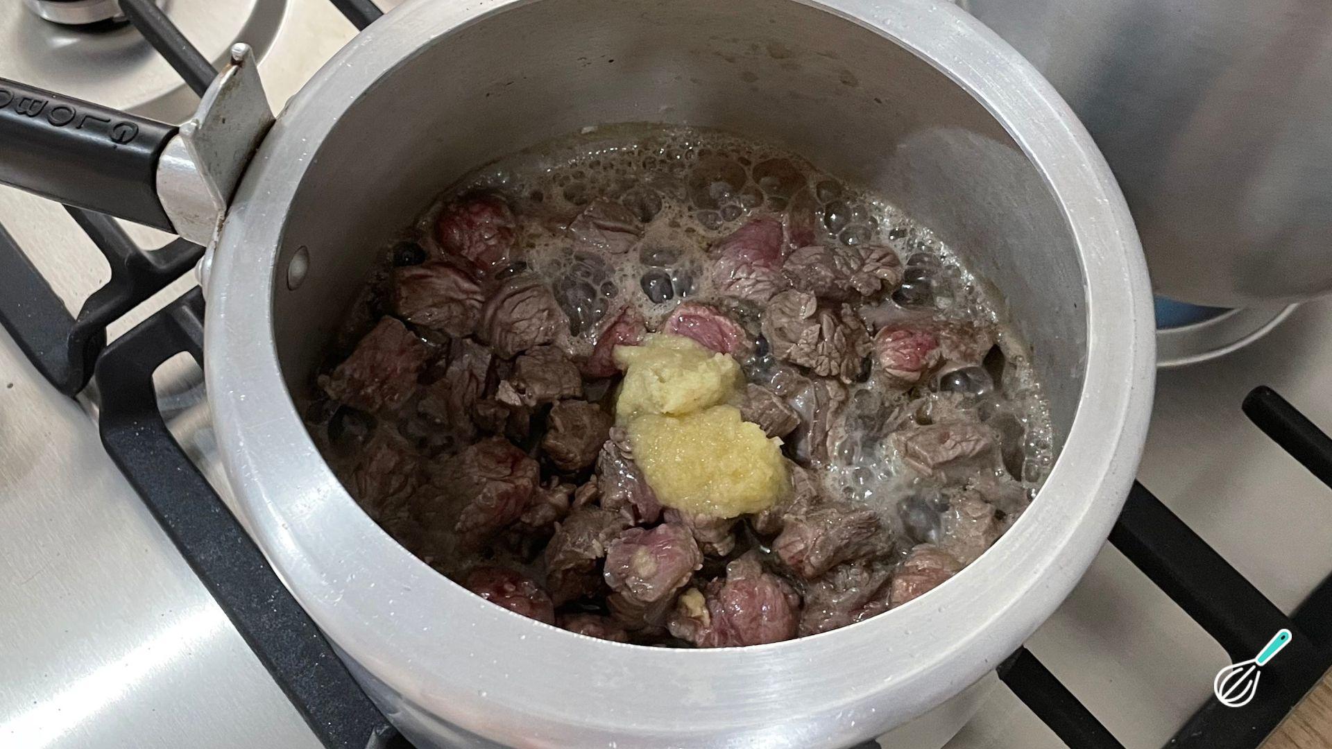 Despeje a água quente, tampe a panela e cozinhe por 30 minutos contados a partir do momento que a panela apitar. Espere a pressão sair totalmente, abra a tampa e verifique se a carne já está macia. Se não estiver, cozinhe por mais 5 minutos - se necessário adicione mais água.