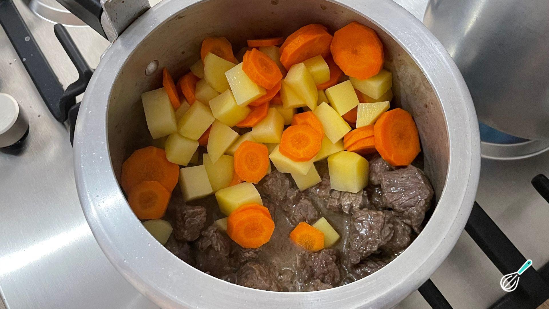 - Picadinho de carne com legumes na panela de pressão: o diferencial dessa receita é que leva também linguiça defumada e vinho na preparação, conferindo uma camada extra de sabor!