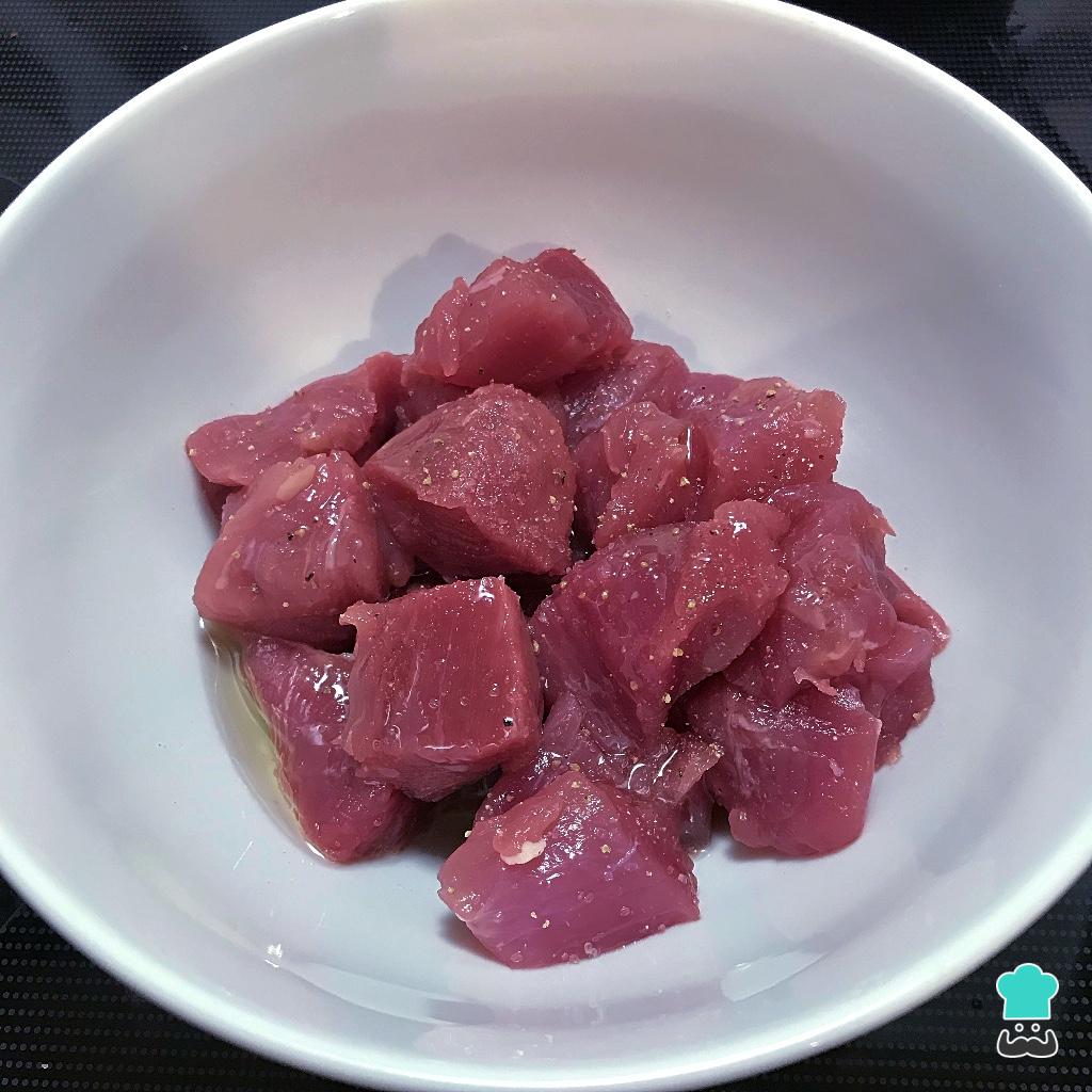 Comece temperando os cubos de filé mignon suíno com o sal, a pimenta e o azeite.