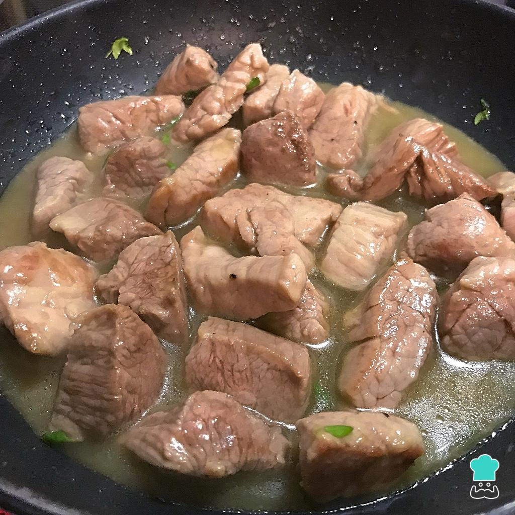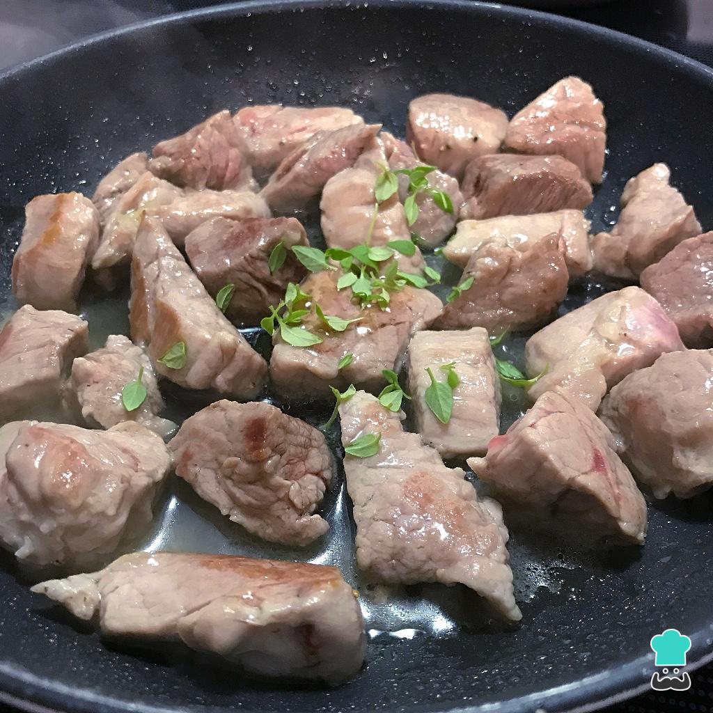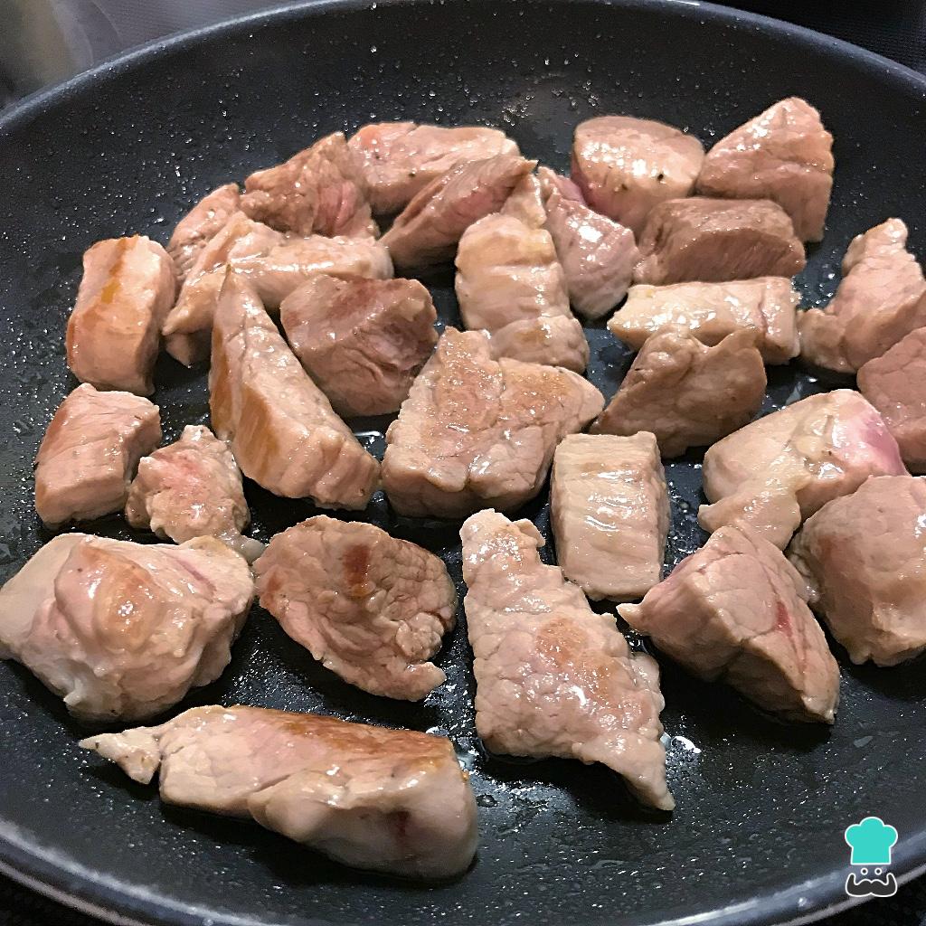 O passo seguinte desta receita de picadinho suíno é selar os cubos de filé mignon suíno numa frigideira em fogo alto até que fiquem levemente dourados.