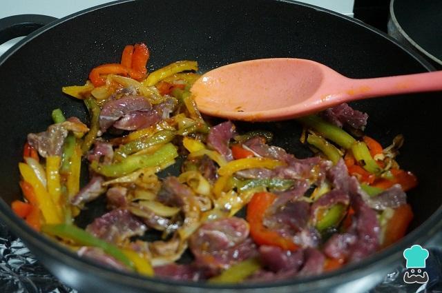 Enquanto isso corte a carne em tirinhas, para conseguir um picadinho. Tempere com sal e pimenta.
