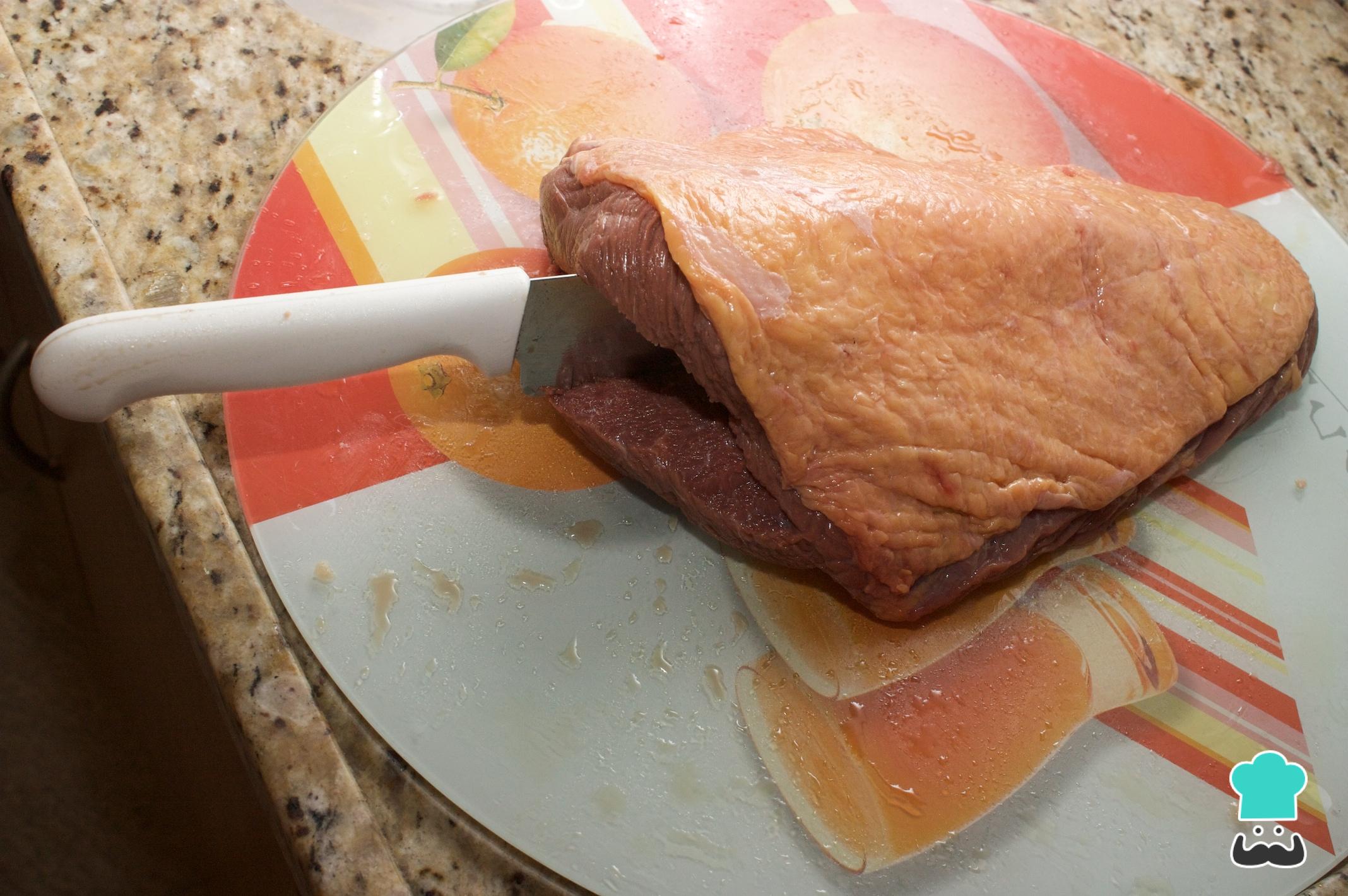 Para fazer essa receita de picanha no forno é preciso inverter a peça de carne. Para isso use uma faca afiada e faça um corte por dentro da peça da carne, na parte mais larga, separando a parte de cima da parte de baixo e sem furar as laterais.