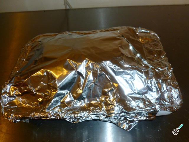 Coloque a carne em uma assadeira untada e cubra com papel alumínio. Pique o papel alumínio em 3-4 sítios, para que possa sair alguma umidade, e coloque assando no forno a 180ºC por 30-35 minutos.