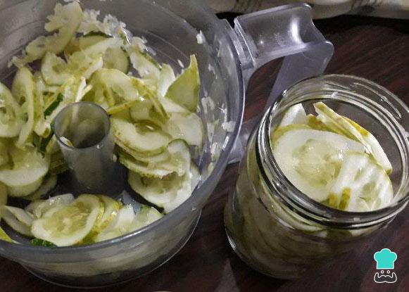 Enquanto os ingredientes fervem, lave e corte os pepinos em rodelas ou processe-os. Disponha os pepinos fatiados em vidros devidamente higienizados.