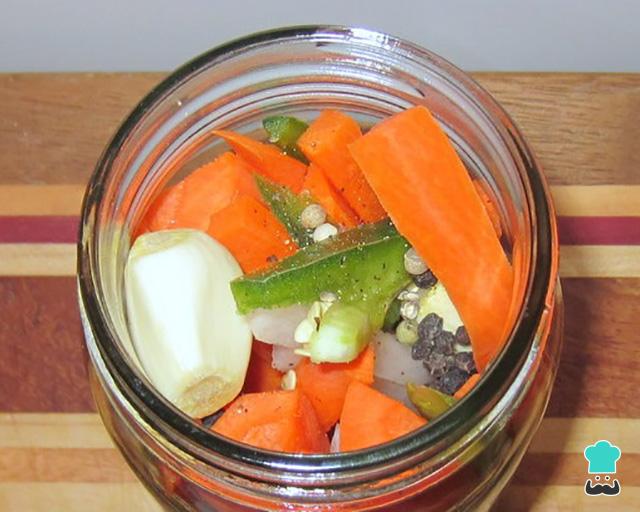 Coloque para ferver a água, o vinagre, os alhos, os cravos, as sementes de mostarda, o açúcar e o sal por 5-10 minutos. Enquanto isso descasque as cebolas e as cenouras e retire as sementes do pimentão. Corte os legumes em pedaços de tamanho semelhante.