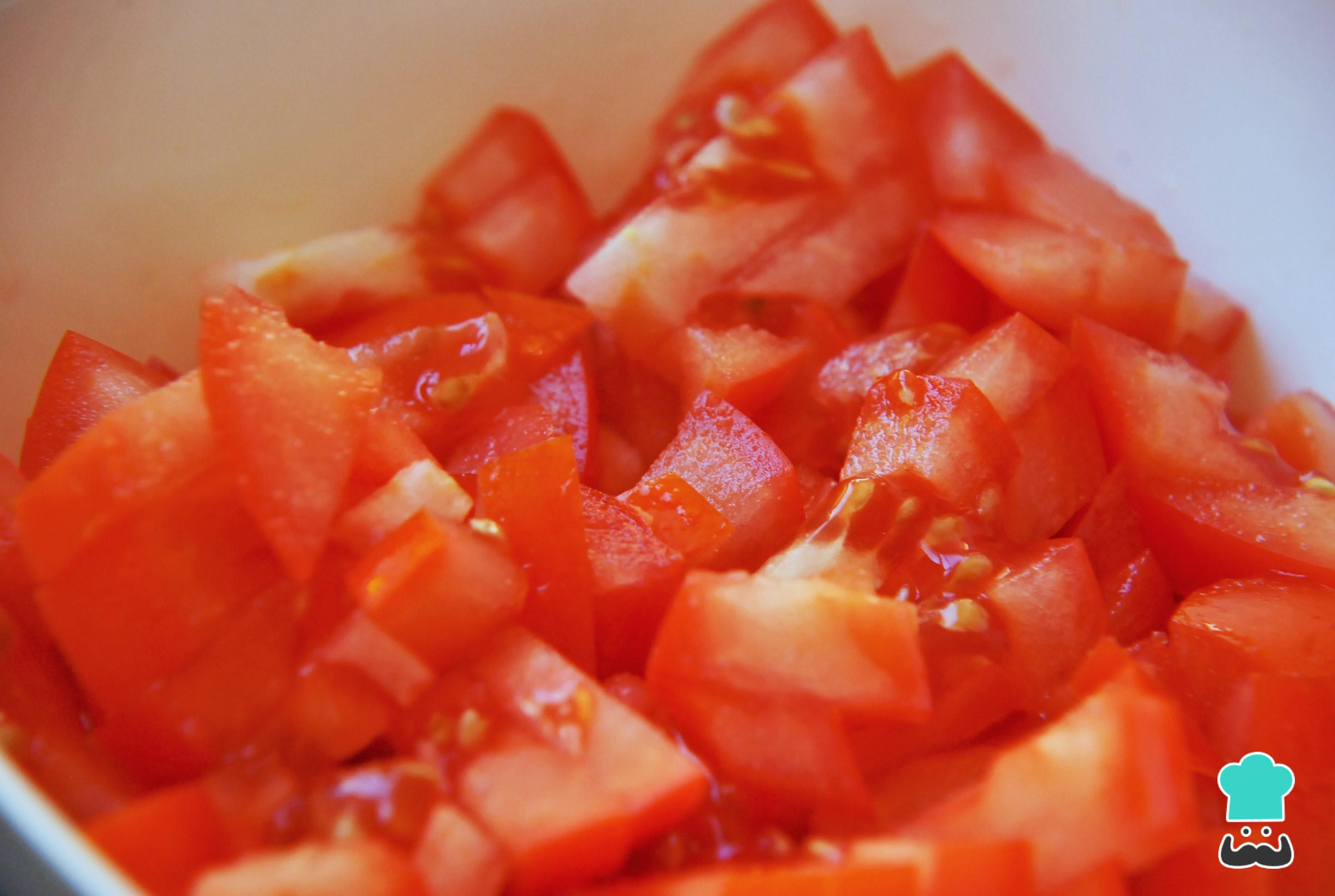 É muito fácil fazer pico de gallo, comece por lavar e cortar os tomates finamente. Tente não esmagar os tomates, simplesmente corte em pedaços pequenos.
