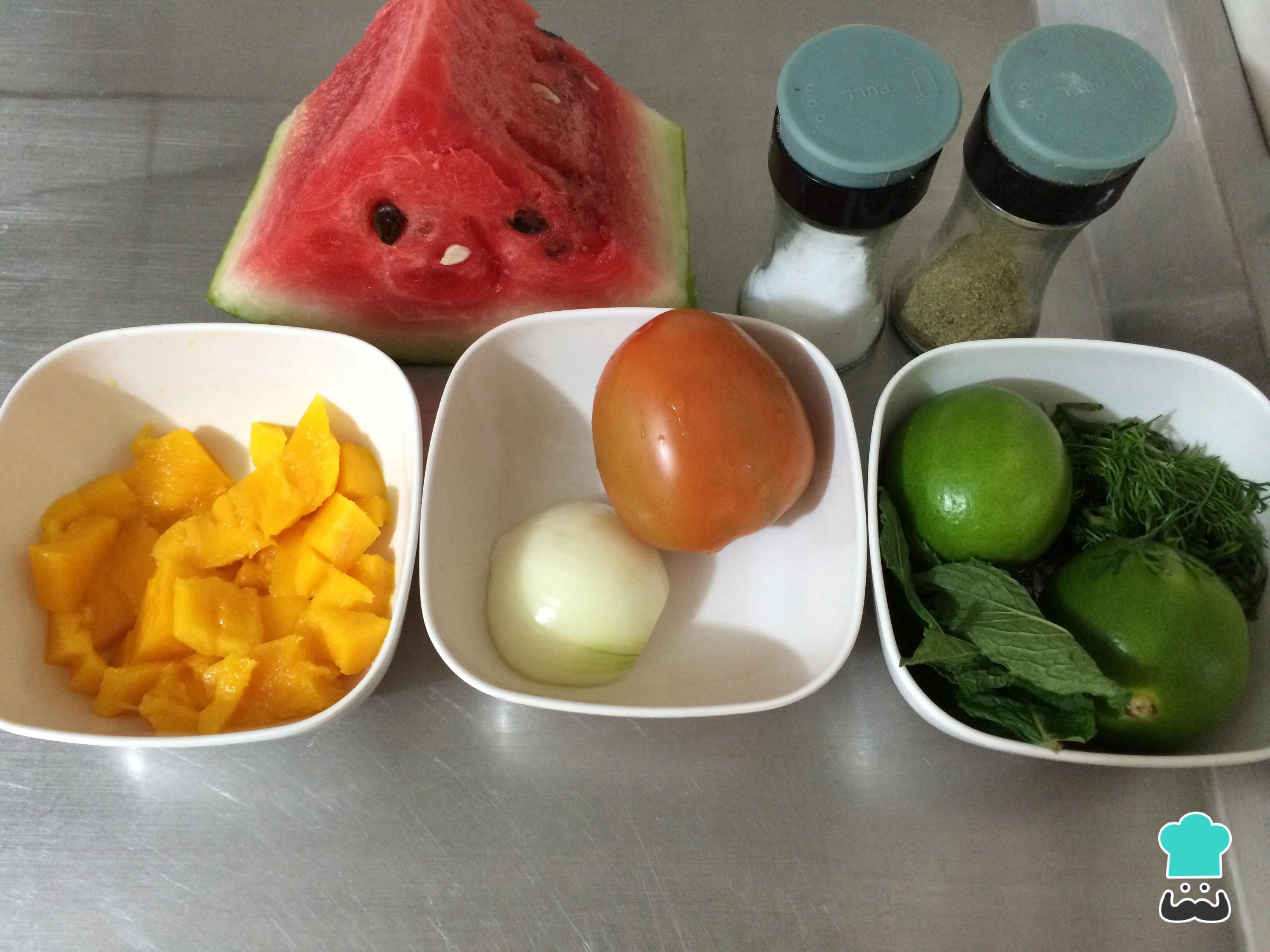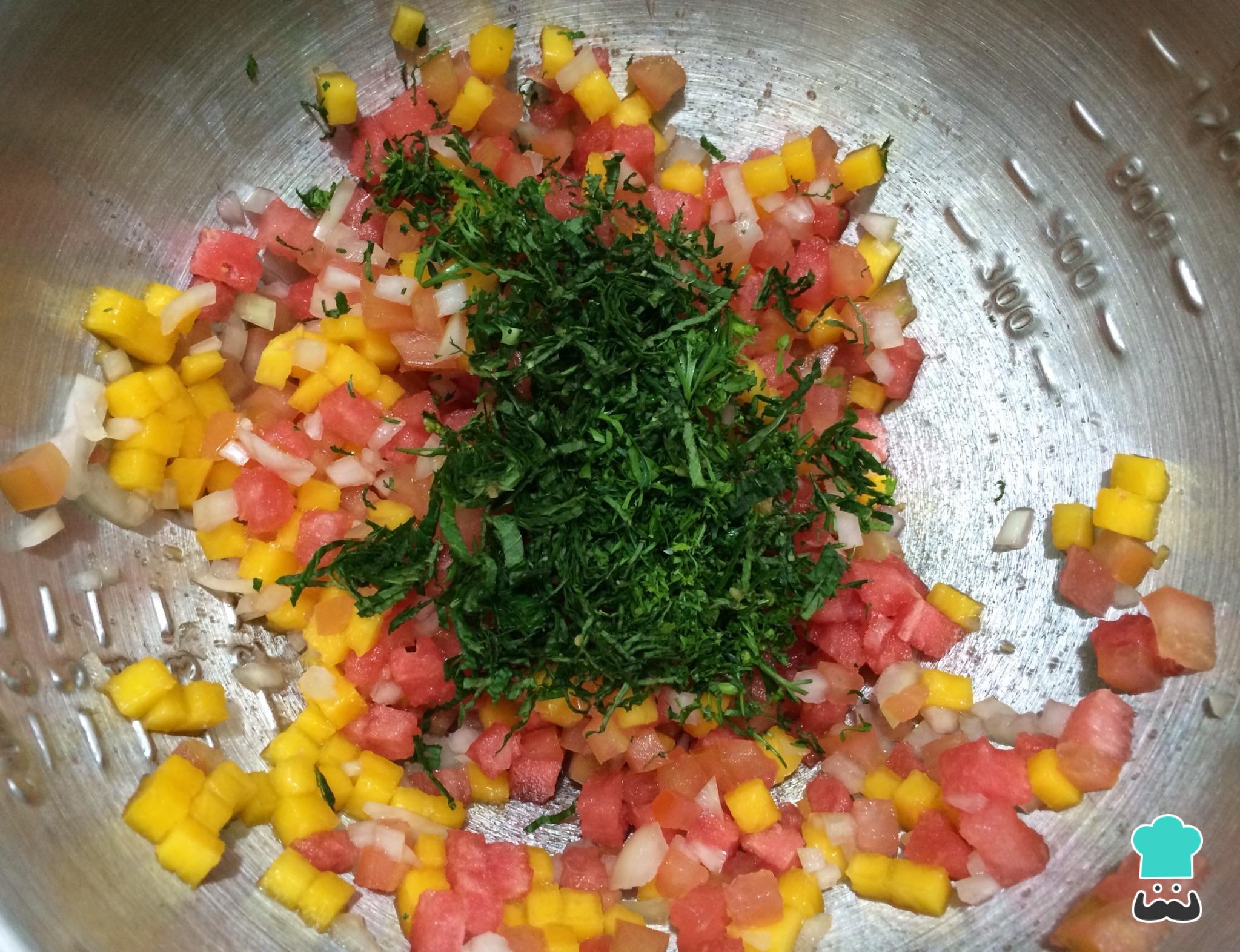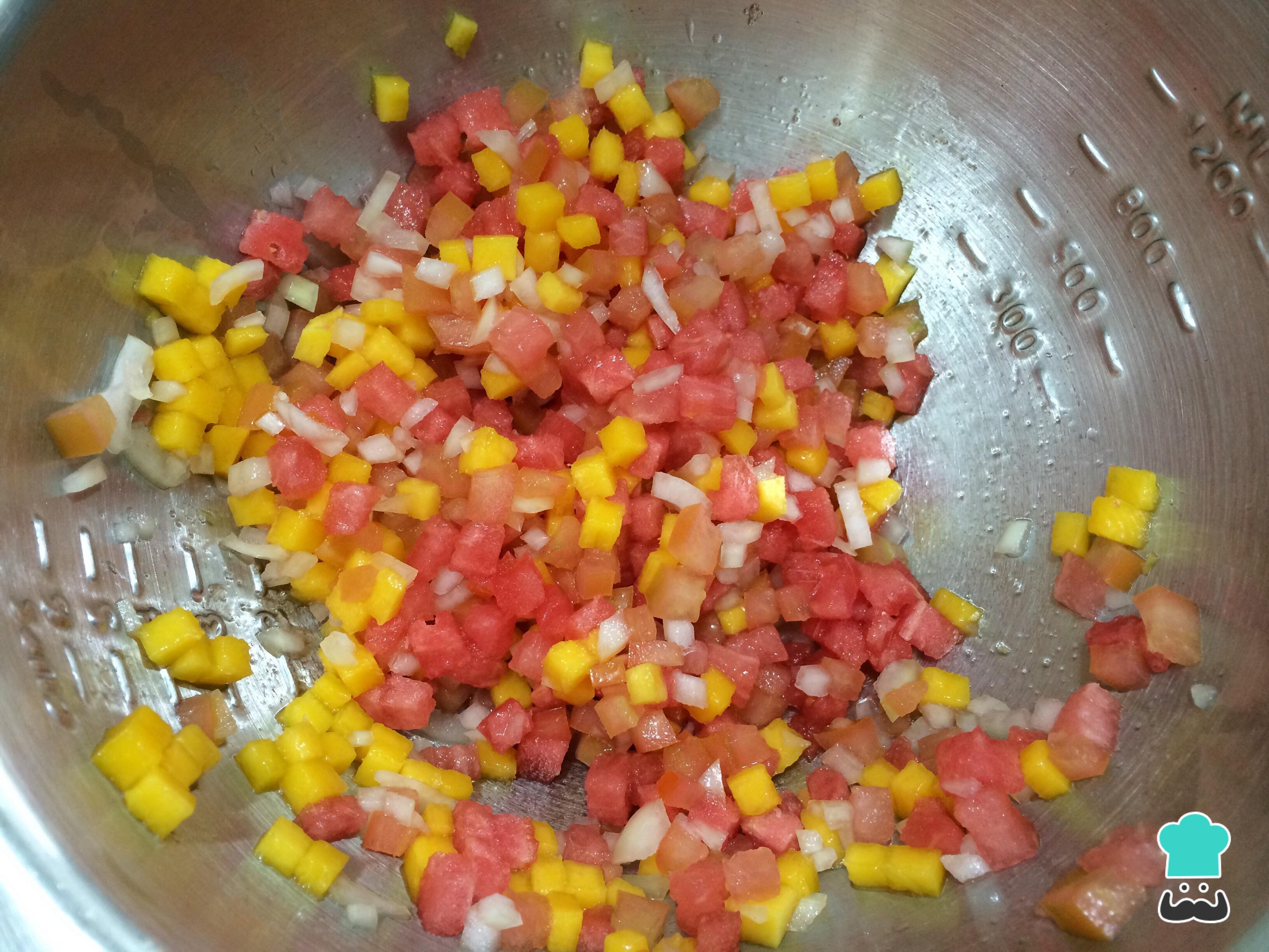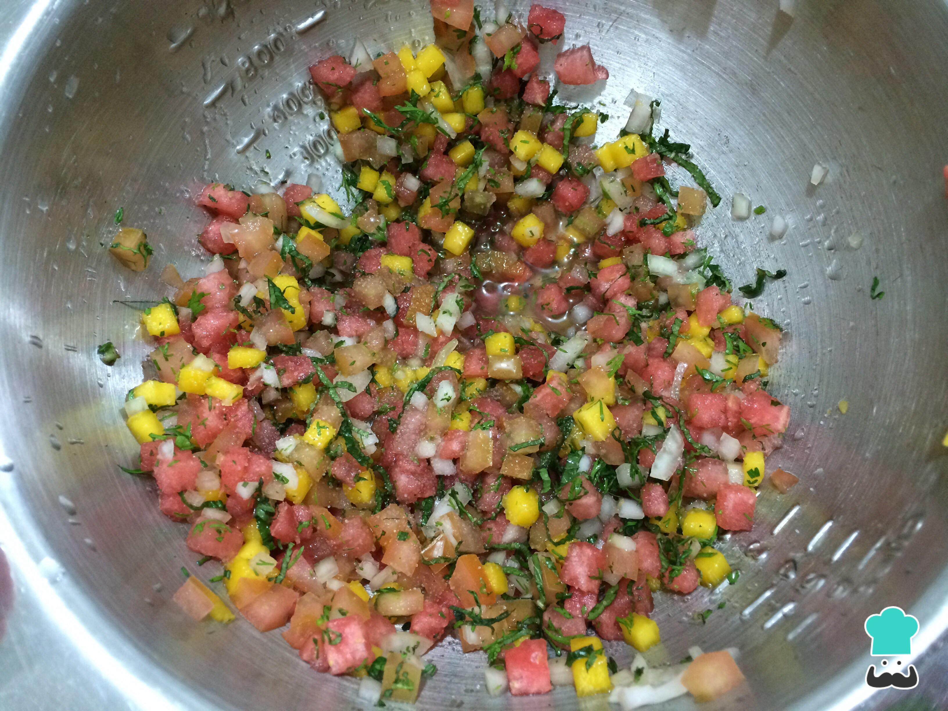 Em uma tigela misture o tomate, a melancia sem sementes, o mango sem casca e a cebola, tudo cortado em cubos pequenos, de preferência com o mesmo tamanho.