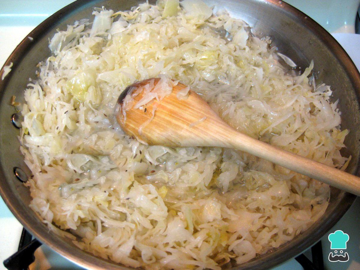 Para fazer essa receita de pastel típico polonês comece por preparar os recheios. Para o recheio de chucrute coloque a manteiga numa panela, deixe derreter e doure nela a cebola até ficar transparente. Junte o chucrute, tempere com sal e pimenta e cozinhe por mais 5 minutos. Retire do fogo e deixe esfriar.