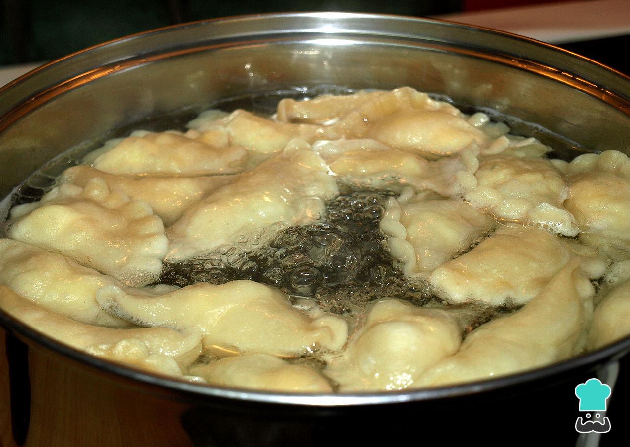 Leve para ferver uma panela com água abundante e sal e cozinhe os pierogis até eles boiarem, o que demorará cerca de 5 minutos. Retire com uma escumadeira.