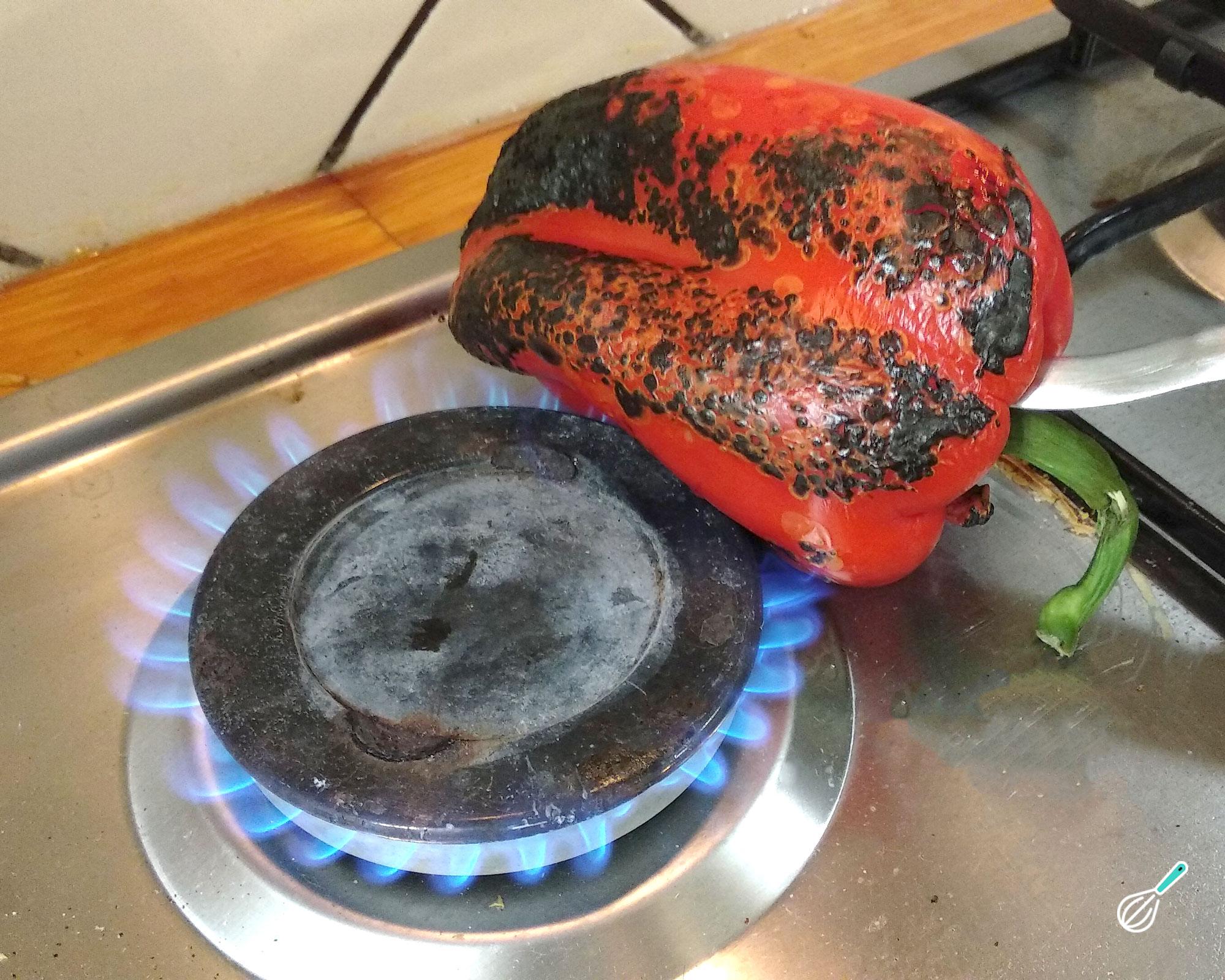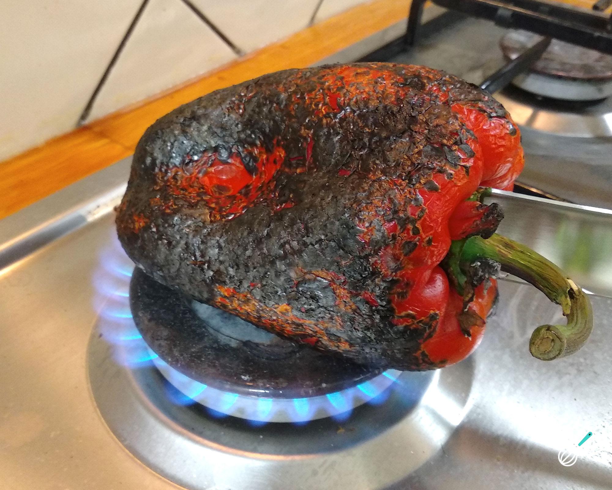 Neste processo apenas a pele do pimentão ficará queimada, o pimentão não pegará fogo nem ficará carbonizado, pode confiar! Seja paciente pois, dependendo do tamanho do seu pimentão e da chama do seu fogão, pode levar até meia hora para que o pimentão fique completamente queimado por fora.