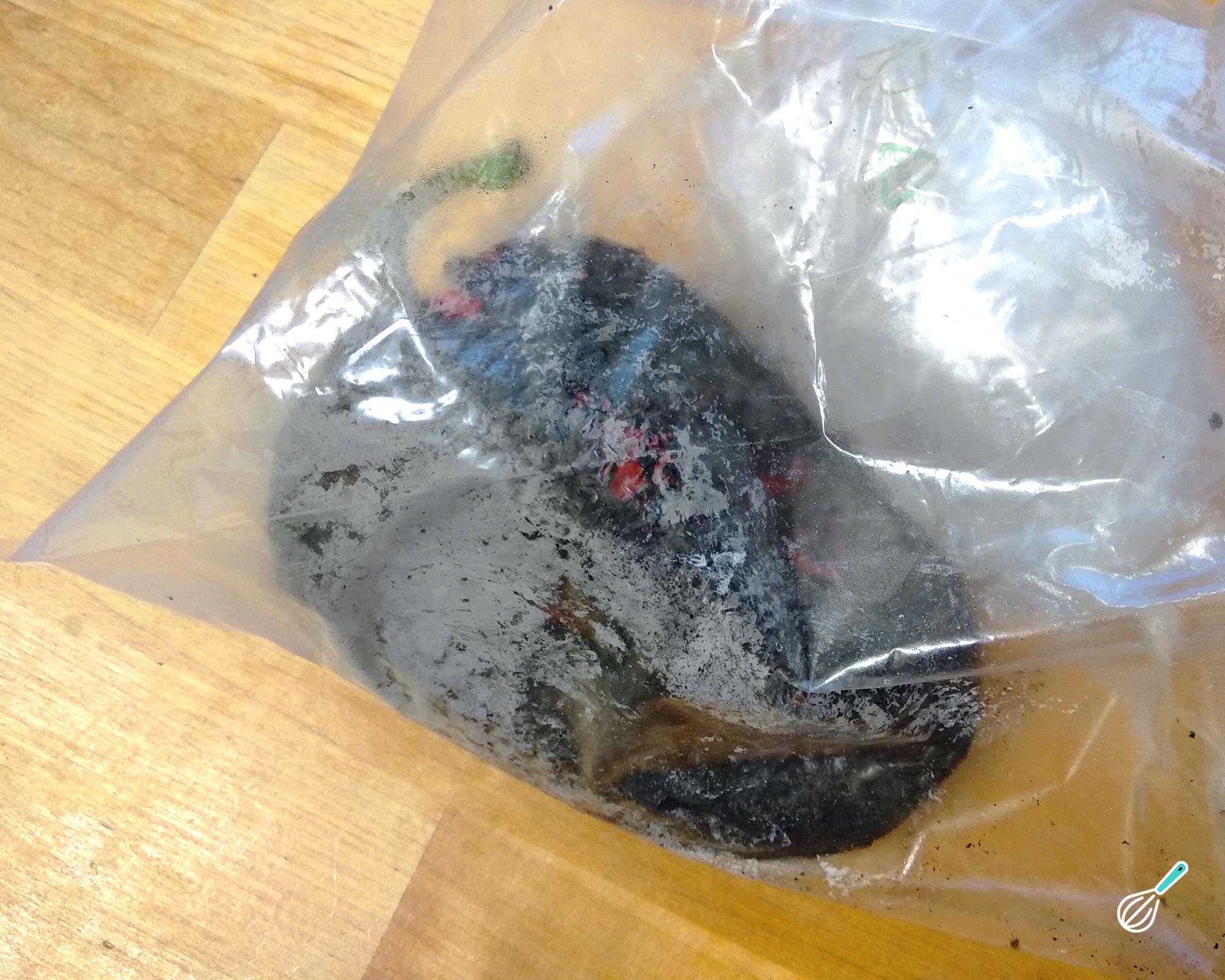 Quando todo o pimentão estiver queimado por fora, coloque-o cuidadosamente dentro de um saco plástico. Amarre o saco plástico e reserve por uns 15 minutos. Durante esse tempo o pimentão vai esfriar e a pele, por conta da umidade dentro do saco plástico, irá se desprender facilmente!