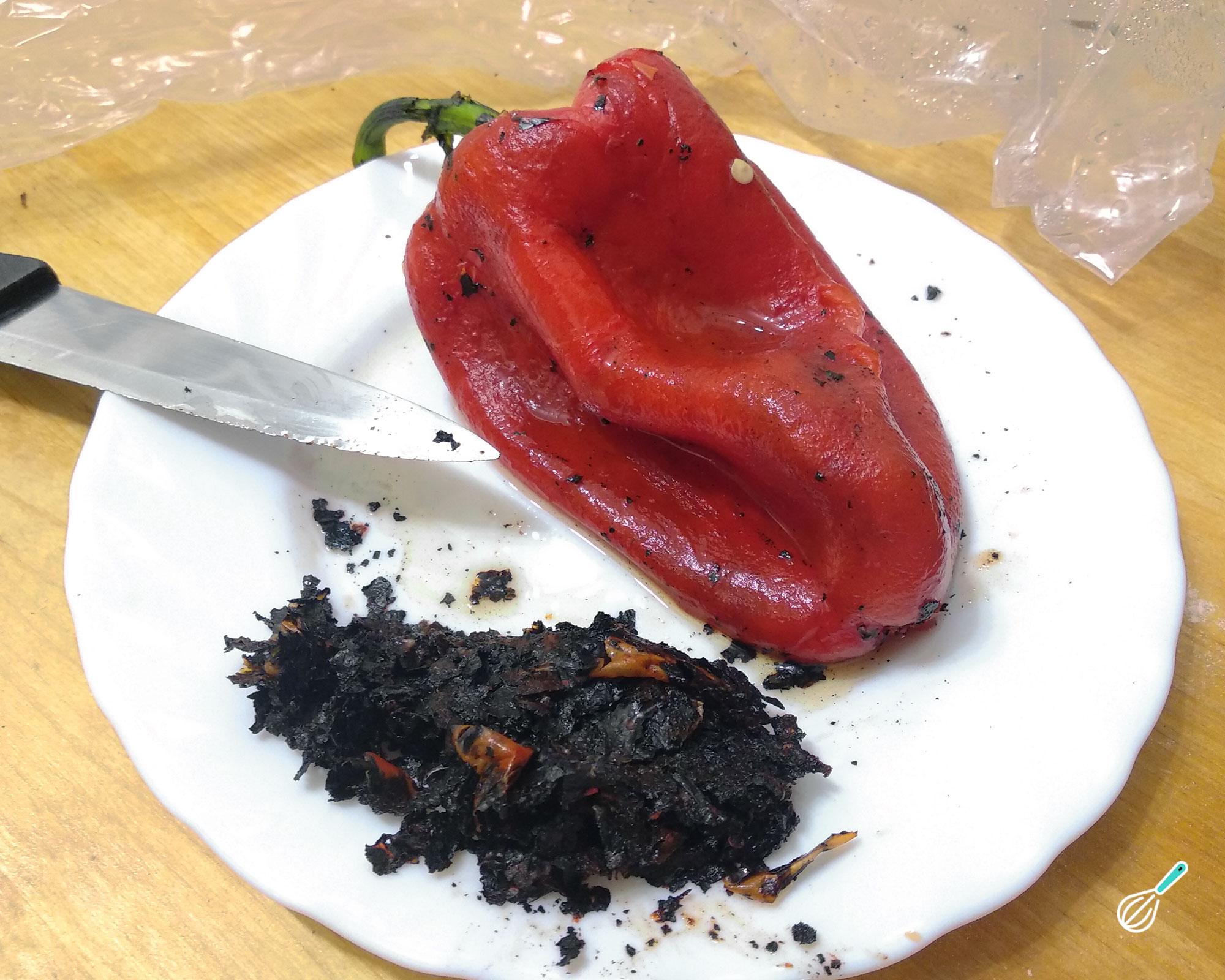 Depois retire o pimentão para um prato e raspe a pele com uma faca. Você nem vai acreditar como fica fácil tirar a pele do pimentão! Termine de limpar o pimentão usando um pano umedecido.